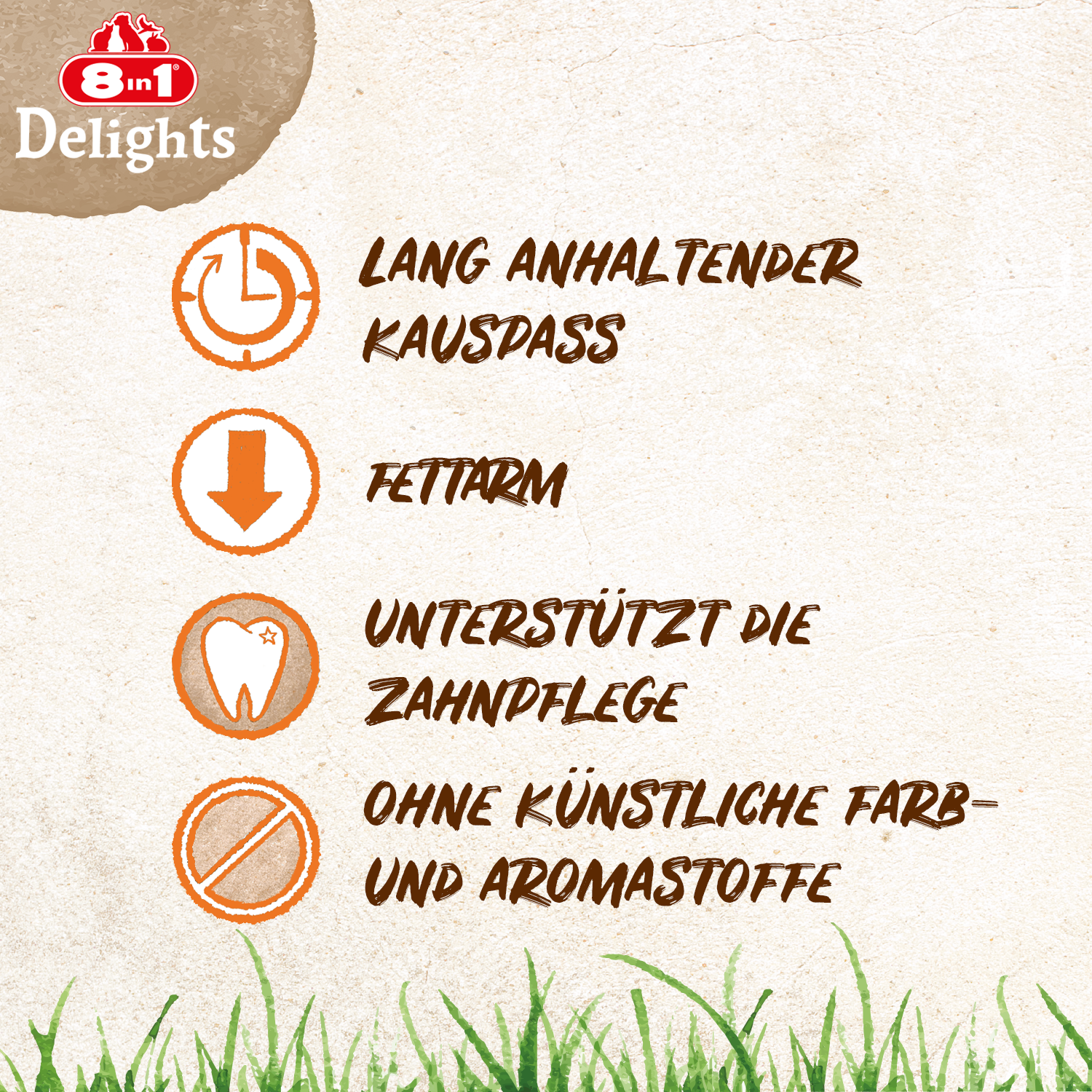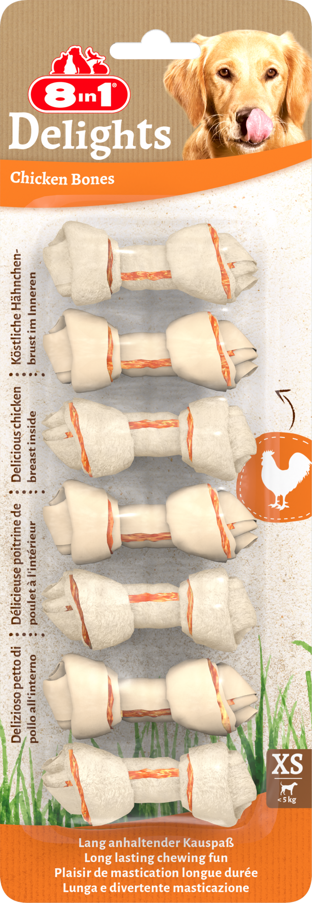 Delights Bones by 8in1 are tasty and nutritious chews that are available for four-legged friends of different sizes. The low-fat chew made from tasty beef skin is flavoured with delicious chicken breast and is ideal as a snack between meals. The oven-cooked snack contains plenty of protein and contains no artificial colours or flavour enhancers. As no sugar, GMOs or gluten are added to the snack, it is an excellent addition to conventional food.