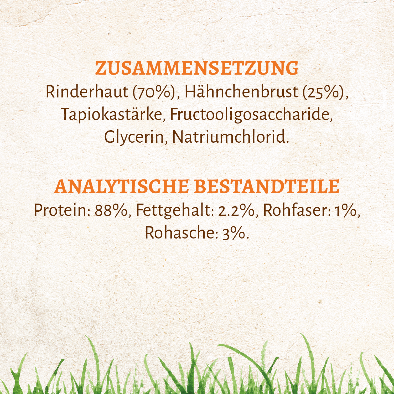 70 % Rawhide, 25 % Chicken Breast, Tapioca starch, Fructooligosaccharides, Glycerin, Sodium chloride