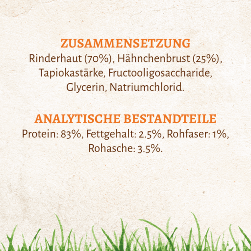 70 % Rawhide, 25 % Chicken Breast, Tapioca starch, Fructooligosaccharides, Glycerin, Sodium chloride