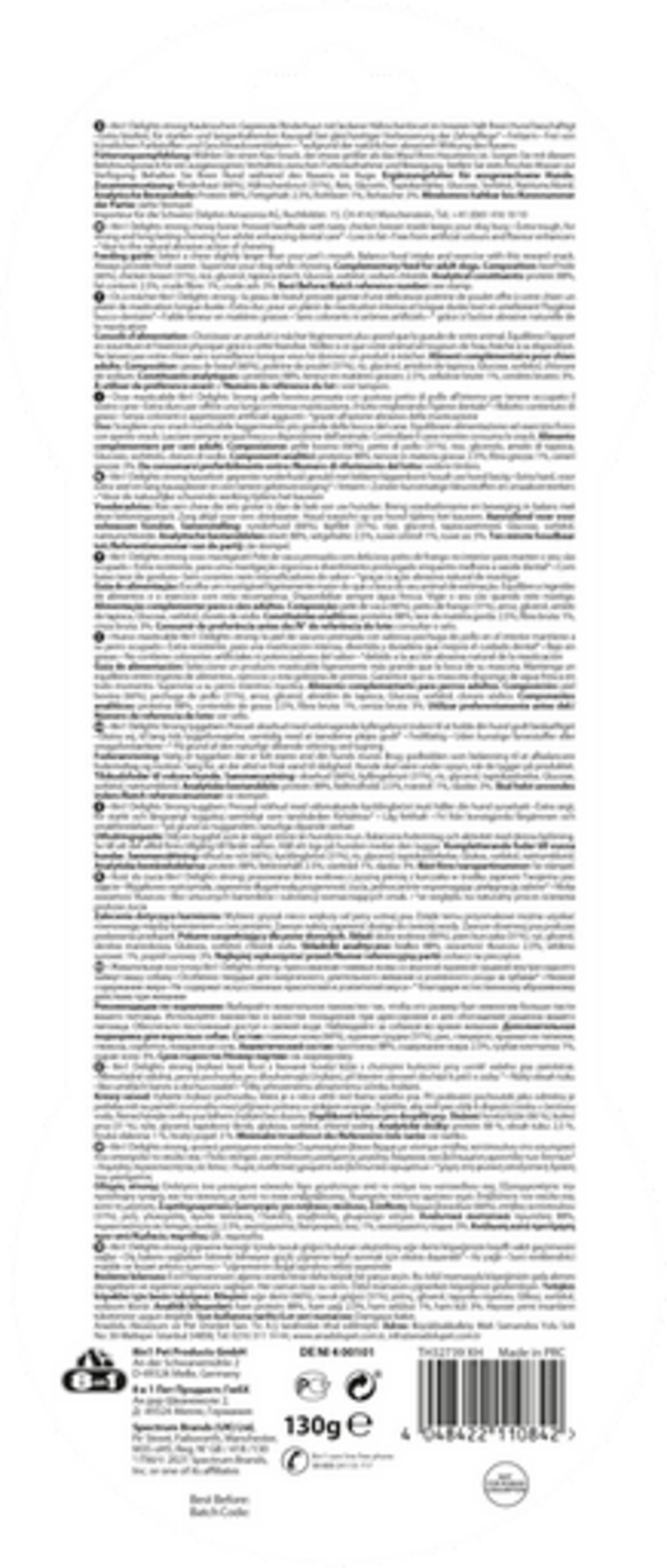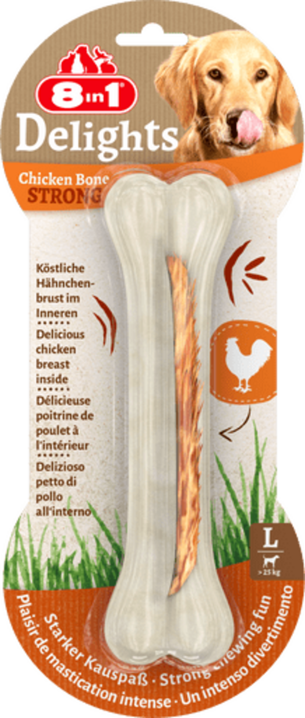 Delights Strong Bones by 8in1 are tasty and nutritious chews which, thanks to their firmer consistency, are particularly appealing to dogs who love to chew. The low-fat chews are made from tasty beef skin and have delicious chicken breast inside, making them ideal as a snack between meals. The oven-cooked snack contains plenty of protein and no artificial colours or flavour enhancers. As no sugar, GMOs or gluten are added to the snack, it is an excellent addition to conventional food.