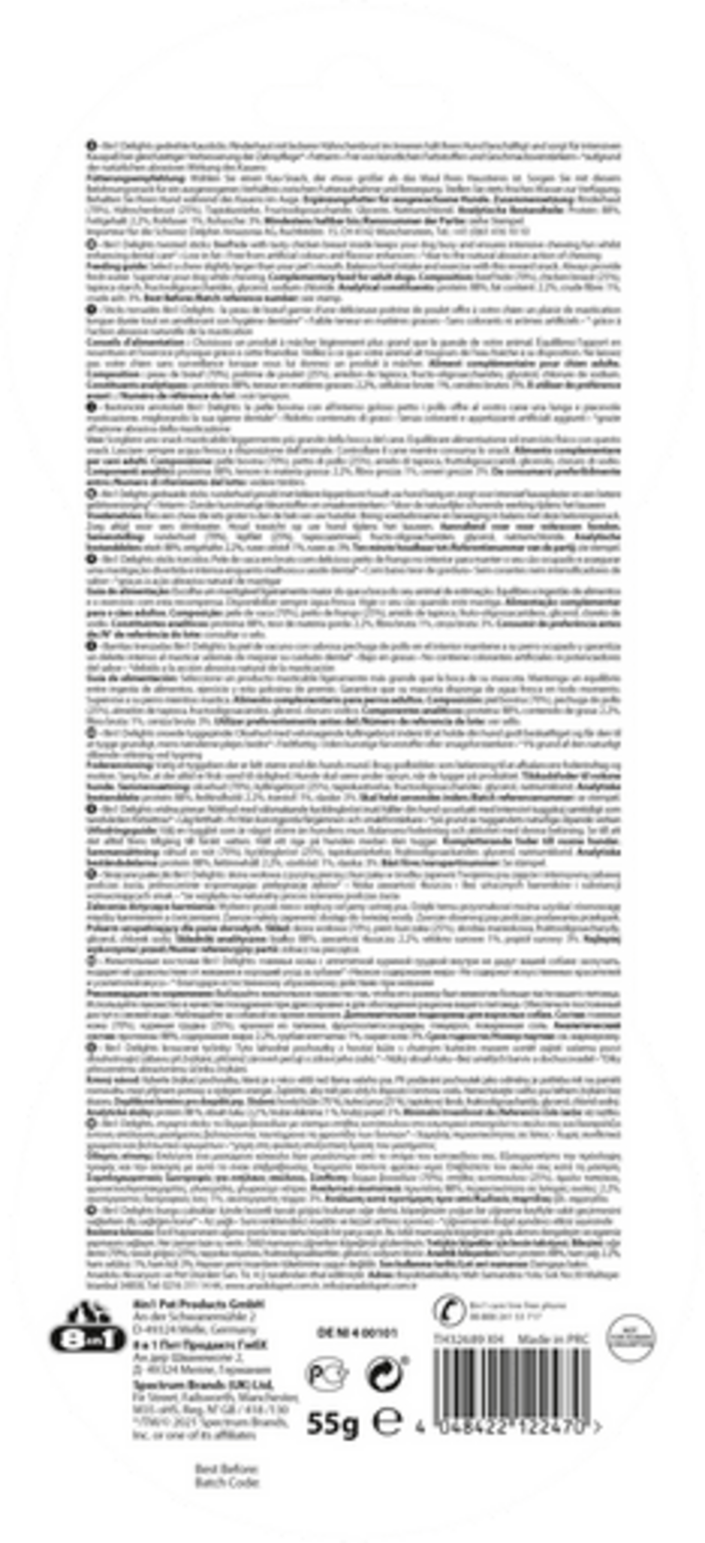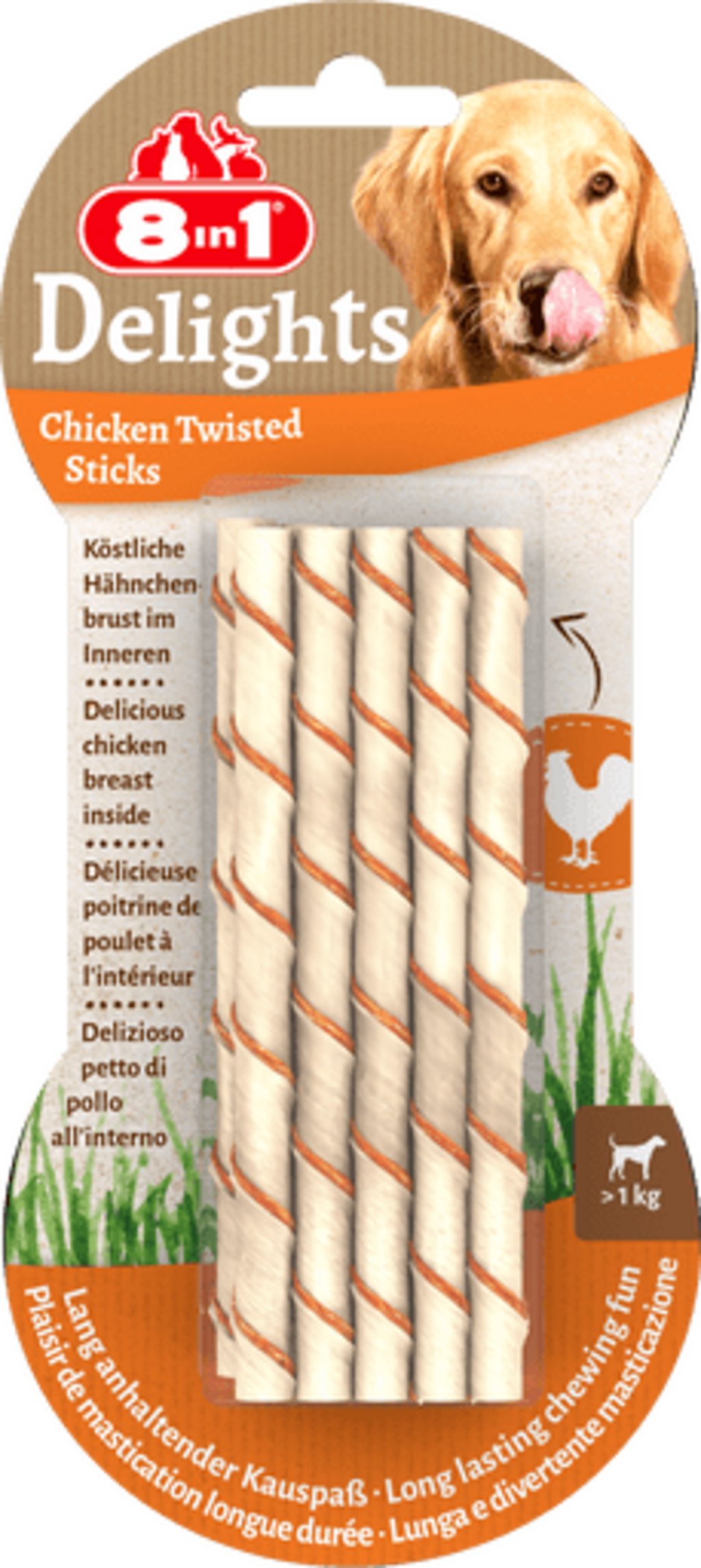The Delights Twisted Sticks by 8in1 are delicious and nutritious snacks that satisfy your dog’s chewing needs! Chewing helps train their masticatory muscles and naturally removes tartar - for sustainable oral hygiene support for dogs!