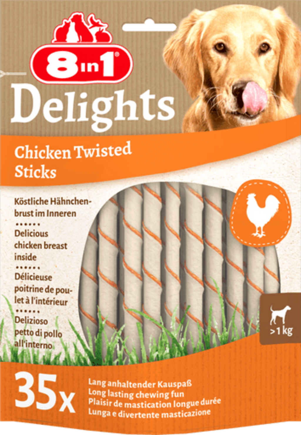 Delicious chicken breast coated in splendid beef hide… Mmm, the gourmet dogs are already drooling! The Delights Twisted Sticks by 8in1 are an excellent chew snack between meals and a wonderful complement to regular pet food! These twisted sticks will not only entertain your dog with hours of chewing pleasure but also contribute to their dental hygiene! As your dog chews, their teeth are mechanically scrubbed, and existing tartar is removed. The tempting aroma of the chicken breast inside will keep them occupied until the snack is completely devoured!