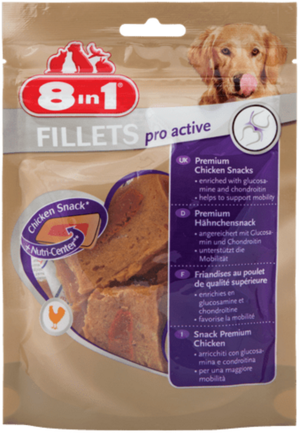 The delicious 8in1 Fillets Pro Active are an outstanding premium snack made from tasty chicken meat to support the mobility of your lovely pet! The snack is enriched with a special nutrient core containing chondroitin and glucosamine: This possesses healthy properties, promoting dogs' vitality and strengthening their bones and joints. The varied snack with only 4.5% fat is optimally suited as a supplement to conventional pet food.