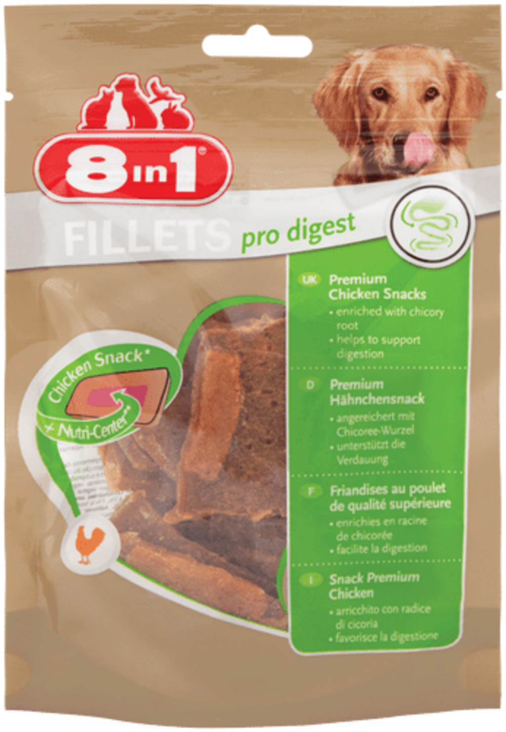 Poor digestion can negatively impact the quality of life for any living being. The delicious 8in1 Fillets Pro Digest effectively and sustainably counteract this: the tasty premium snack made from delicious chicken meat supports your dog's digestion, promotes a healthy gut flora, and ensures a carefree life! The snack is refined with a special nutrient core of chicory root, positively impacting your dog's vitality and providing them with prebiotic inulin. This varied snack contains only 4.5% fat, making it an ideal complement to traditional pet food.