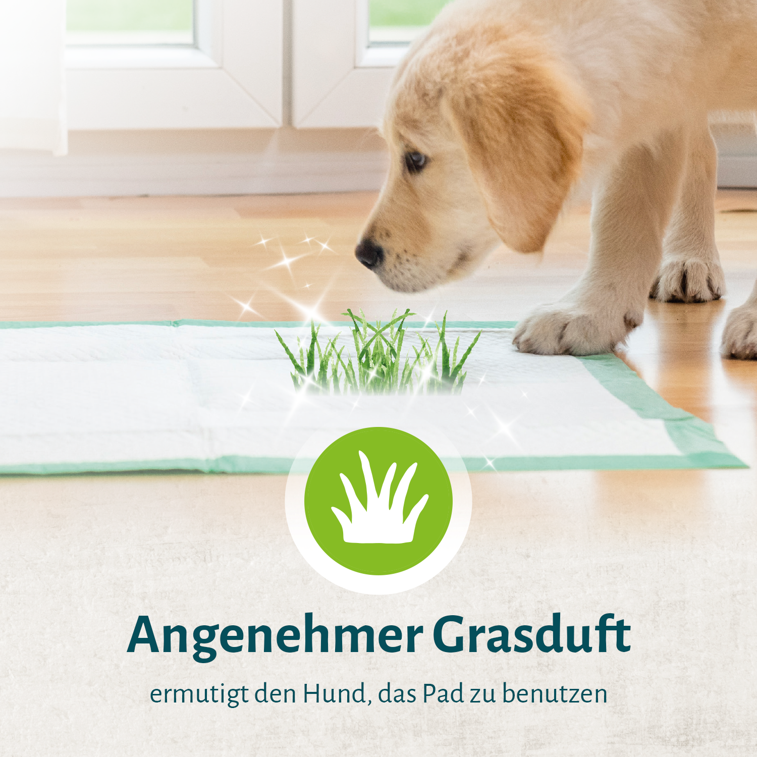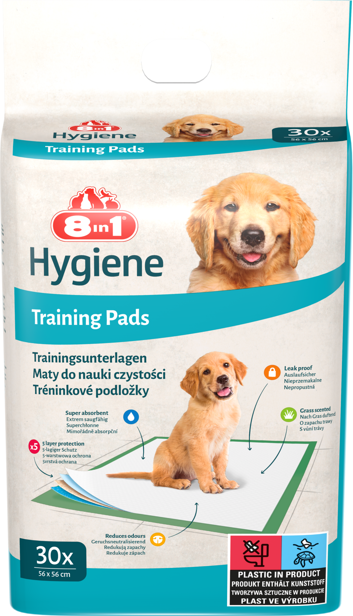 Puppies, elderly, and sick dogs often struggle to control their bladders. With the outstanding 5-layer training pads, we have the perfect solution! The absorbent and leak-proof 8in1 Training Pads are enhanced with a familiar grass scent, naturally attracting house-trained dogs to use them. The easy-to-use pads are also suitable for puppy house training: thanks to the specific inviting grass scent, puppies can learn to associate the smell with potty time. The 5-layer protection effectively traps and reduces urine odour.