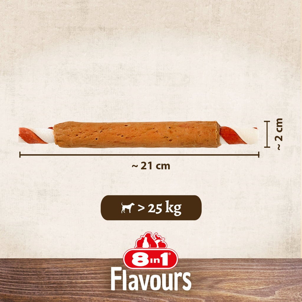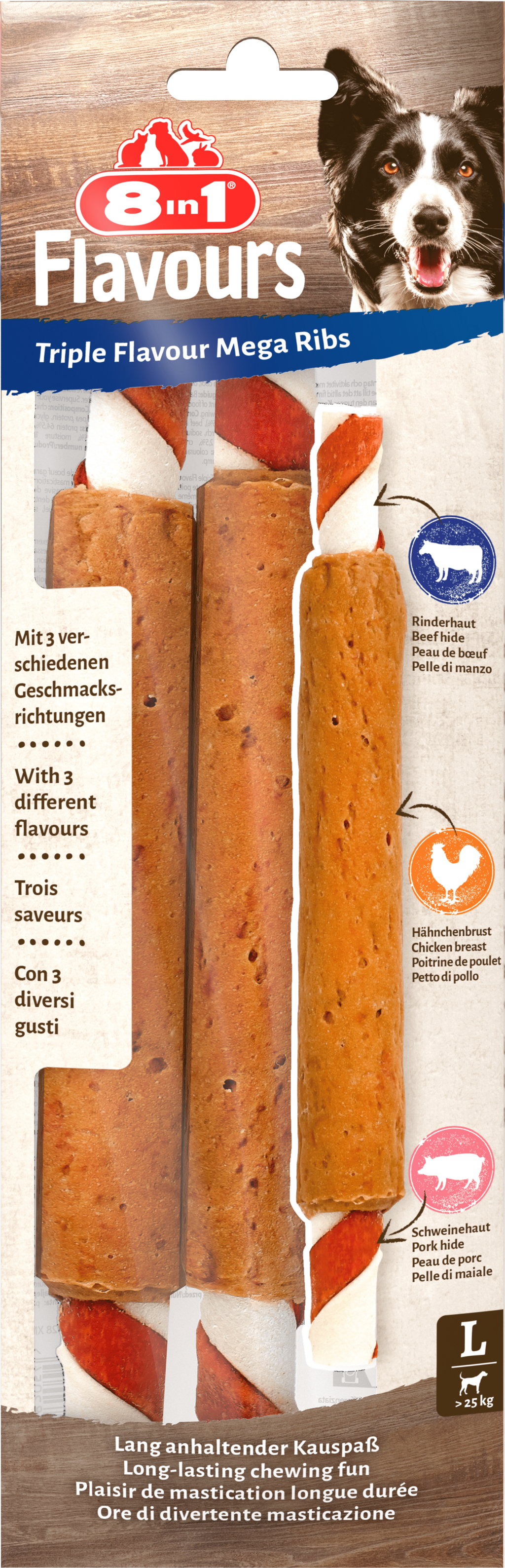 Tough beef and pork hide, coated with crispy chicken breast - all in an XXL format. The Triple Flavour Mega Ribs are designed for large dogs weighing 25 kg or more and offer extended chewing enjoyment. With high protein content instead of excessive fat. A low-fat snack that provides both reward and entertainment.