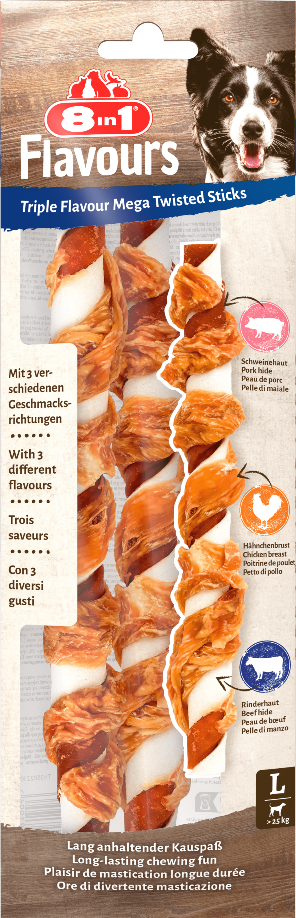 Whether a Labrador, Dalmatian, or Great Dane - your beloved large pet over 25 kg can look forward to the XXL Triple Flavour Mega Twisted Sticks. Chewy beef and pork hide, entwined with crispy chicken breast, promises long-lasting chewing enjoyment. Engage and reward - these chew sticks do it all. Naturally made without added sugars, artificial flavours, or preservatives.