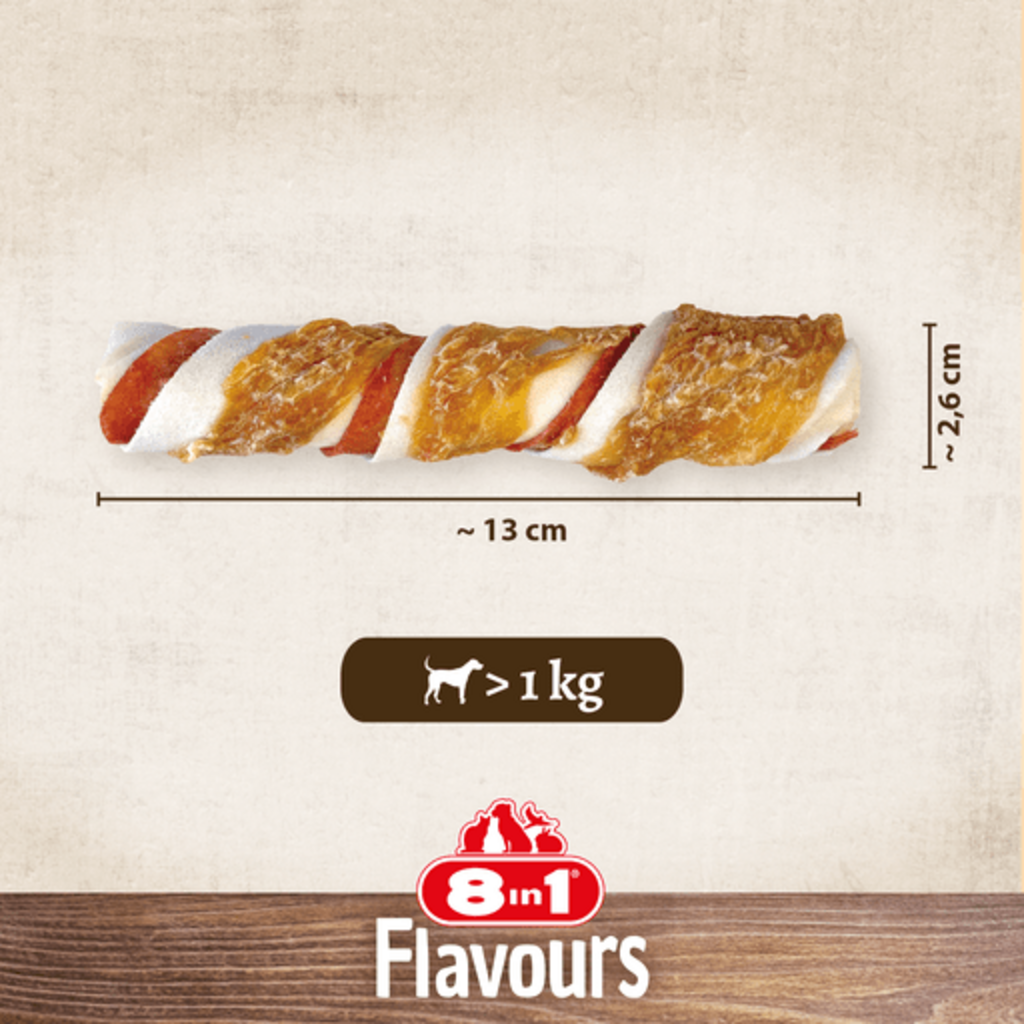 The 8in1 Triple Flavour Rolls make a truly delicious treat! These chew rolls are an exquisite combination of tasty pork and beef hide, encased in succulent and tender chicken breast. Not only are they a delight to the taste buds, but they also benefit your dog's dental health: the abrasive action effectively counteracts tartar and plaque.