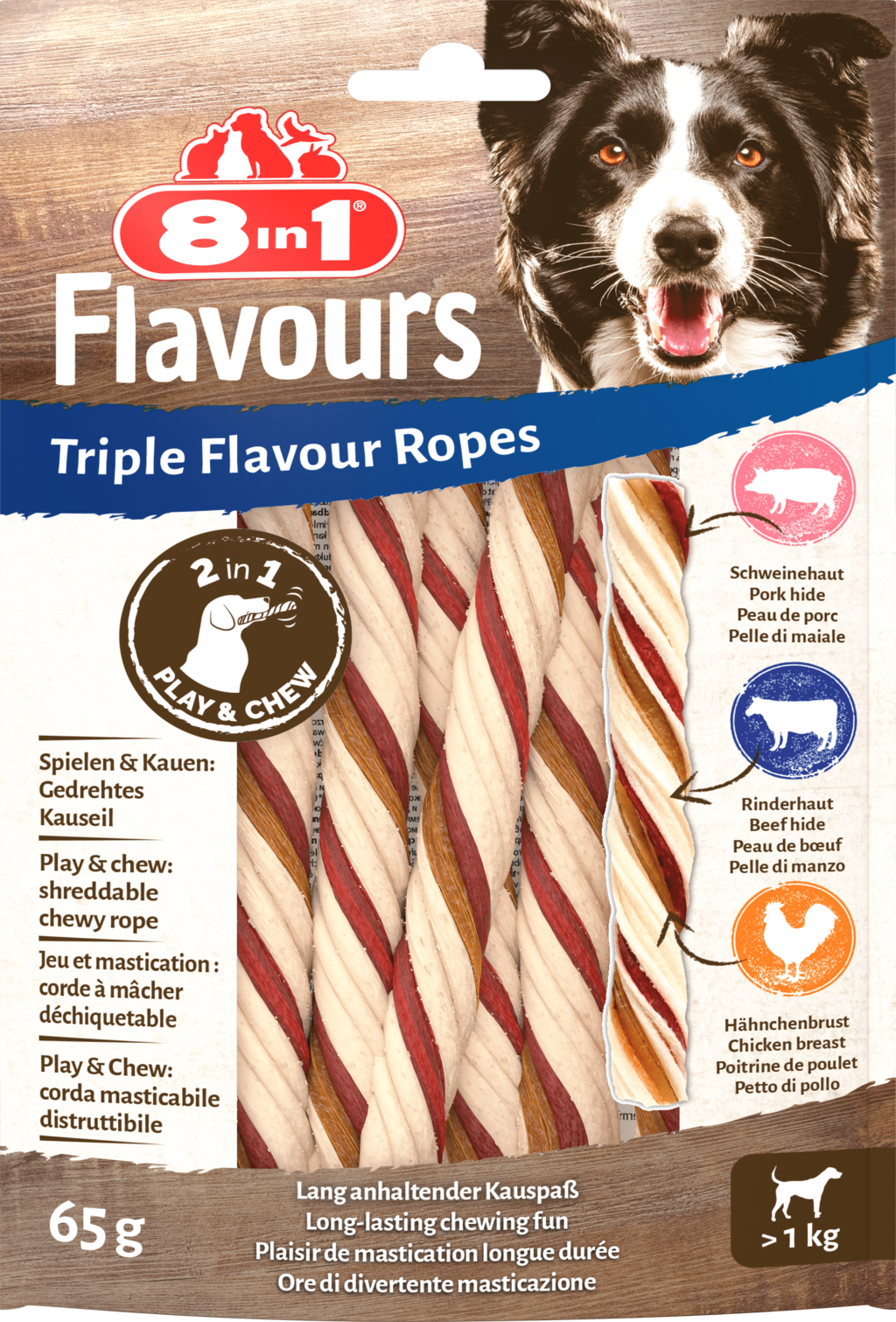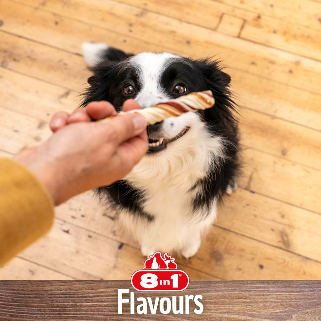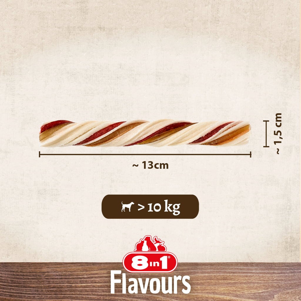 The 8in1 Twisted Chewing Sticks are made from pork skin, cowhide and chicken sausage for the ultimate chewing pleasure. The twisted shape makes chewing a real pleasure. Carefully cooked in the oven and made without additives such as artificial aromas, preservatives and added sugar.