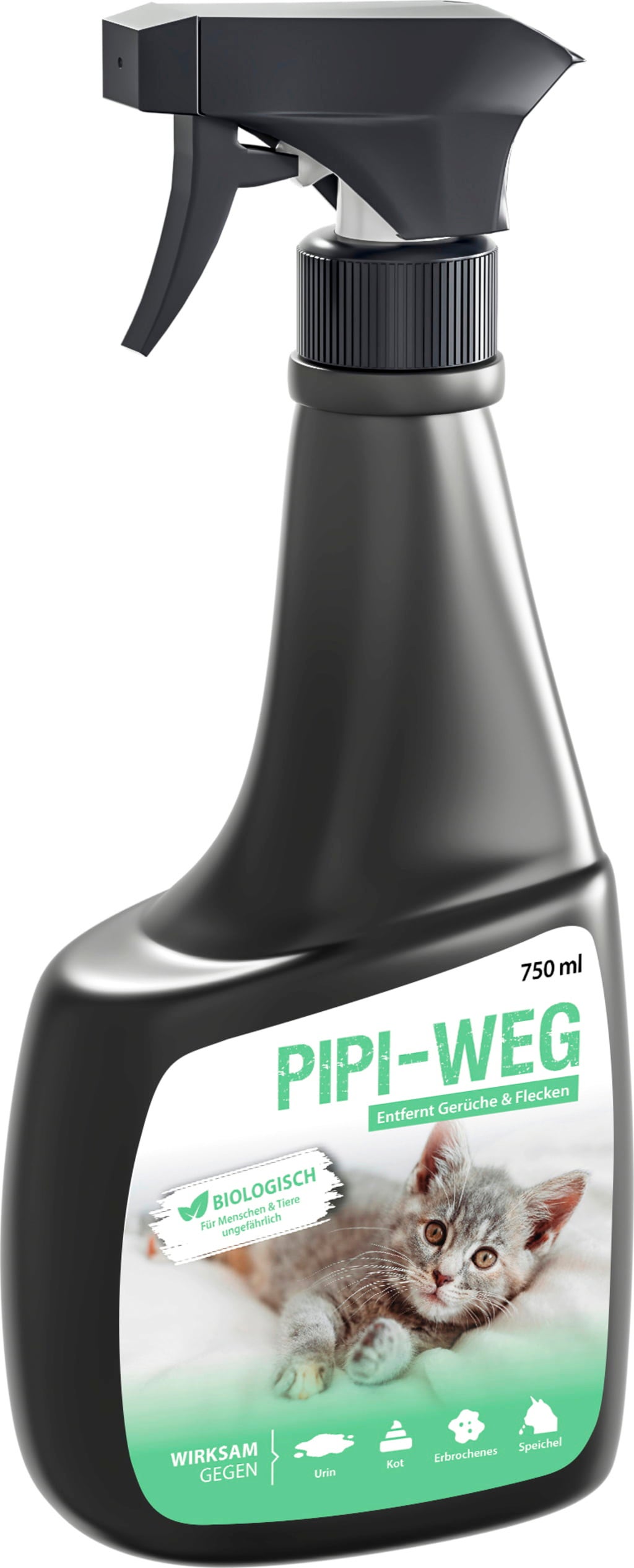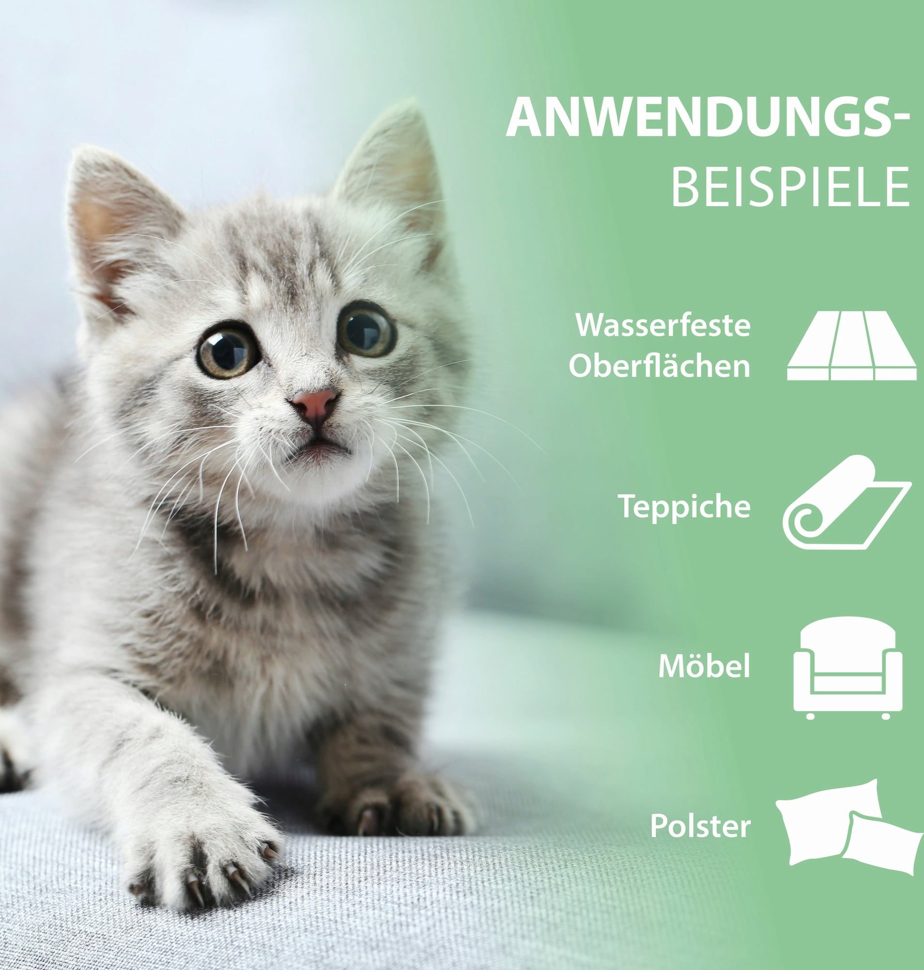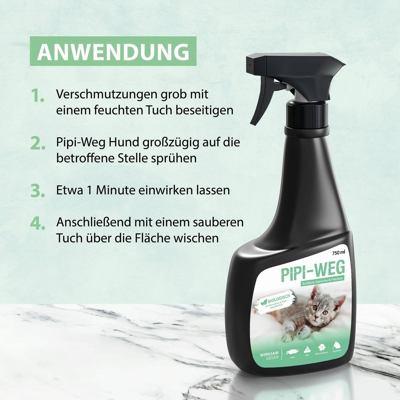 Application: First remove coarse dirt (faeces, balls of fur, vomit, etc.) with a damp cloth. Then spray Pipi-Weg generously onto the area and leave on for at least 1 minute. Then wipe over the surface with a clean cloth. For really stubborn stains (e.g. stains that have already dried), the agent should be allowed to act for 24 hours. Caution: During the entire exposure time, the area should always be kept moist by means of repeated spraying! Wipe up with a clean cloth after the entire procedure!