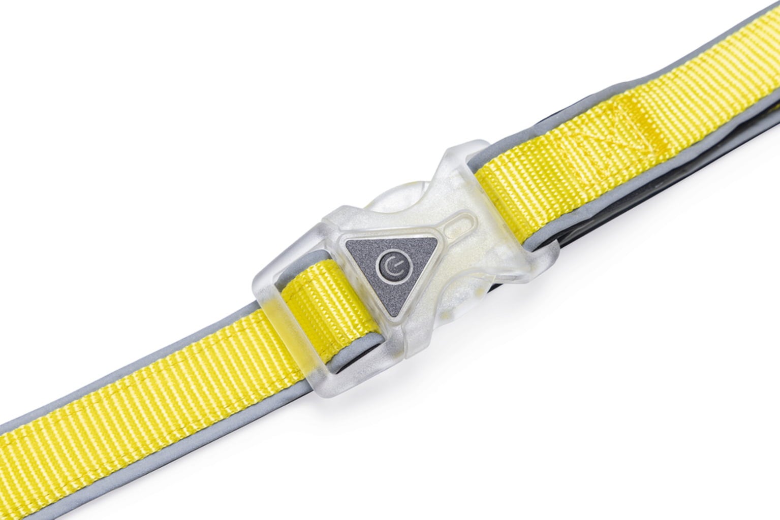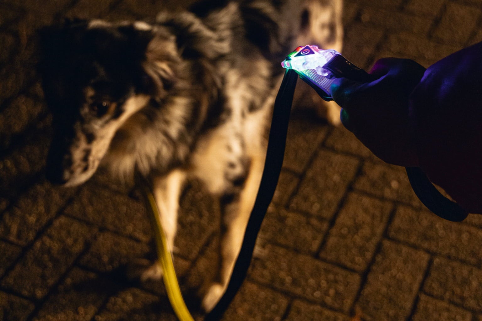 The LED light can be set to three different modes: slow flashing, flashing, and rapid flashing, and it shines in red, green, and blue. This lighting not only ensures visibility but also adds a touch of style. The lead is adjustable, thanks to an additional snap closure, allowing you to decide how much freedom of movement to give your dog.