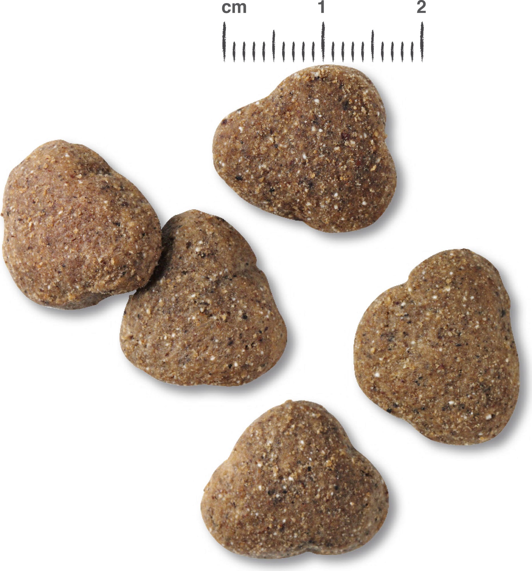 30 % Lamb meat/liver/lung, 30 % Rice, Oat flour from hulled seeds, 10 % Dried lamb protein, 7,5 % Low-ash dried poultry protein, 3,5 % Fish meal from sea fish, De-sugared dried beet pulp, Dried egg, 2,5 % Hydrolysed gelatine, 2,5 % Inactivated and dried brewer's yeast, Dried carob meal, Poultry fat, Plant oils[1], 1,5 % Chia seeds, Hydrolysed poultry liver, Salmon oil, Sodium chloride, Potassium chloride