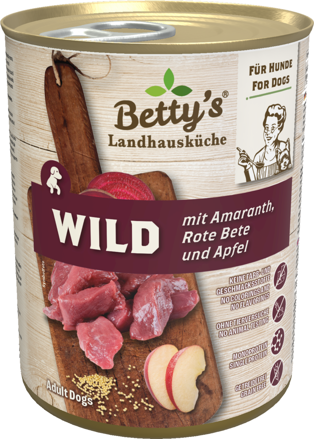 60 % Game meat (Deer, Wild boar), 25,8 % Broth, 5 % Amaranth, 4 % Beetroot, 4 % Apples, 1 % Minerals, 2 % Linseed oil