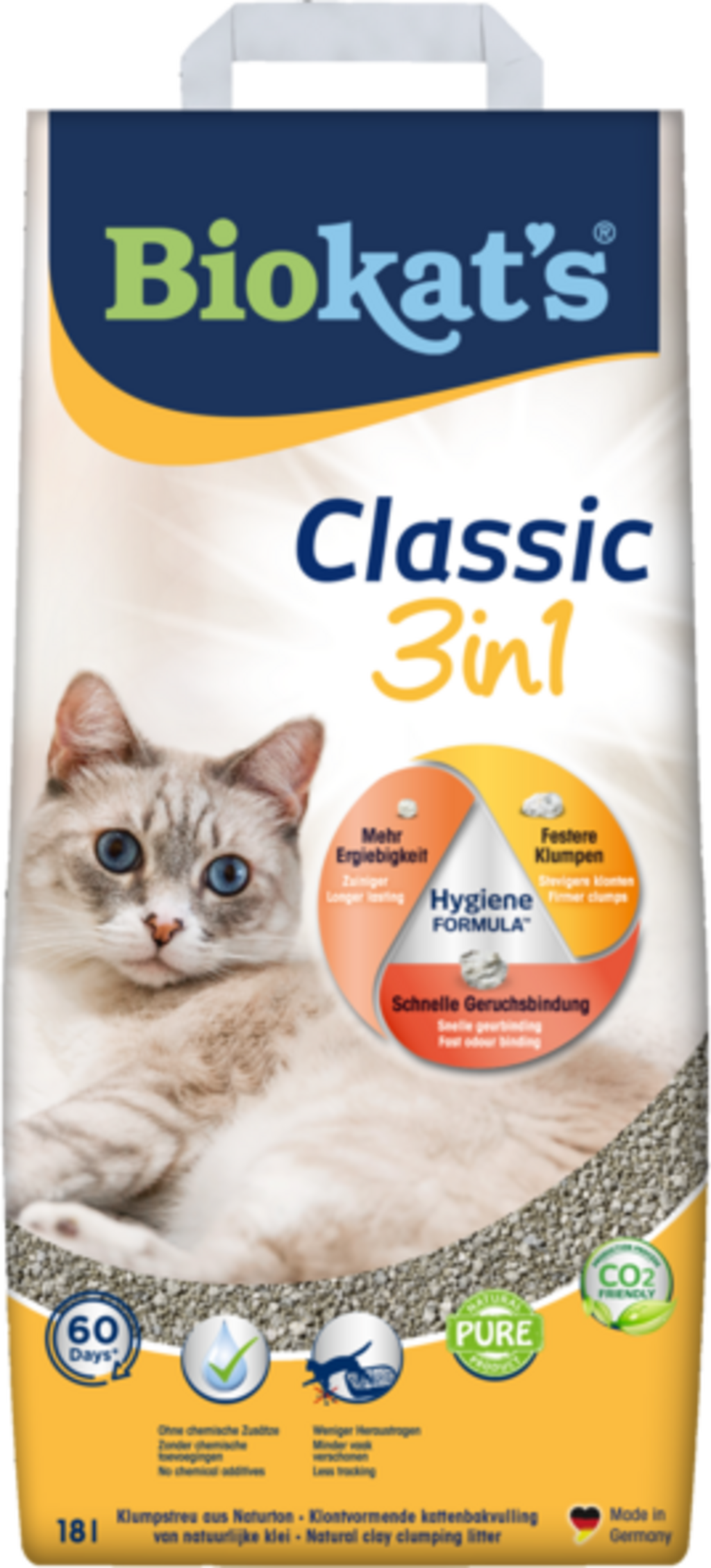 A classic in the Biokat's range, Classic Cat Litter is made from 100% natural clay with three different grain sizes, featuring the advanced Hygiene Formula™. This formulation ensures extra-compact clumps that significantly improve hygiene while quickly binding odours. Additionally, the litter is designed not to stick to your cat’s fur or paws, keeping it neatly contained in the litter tray.