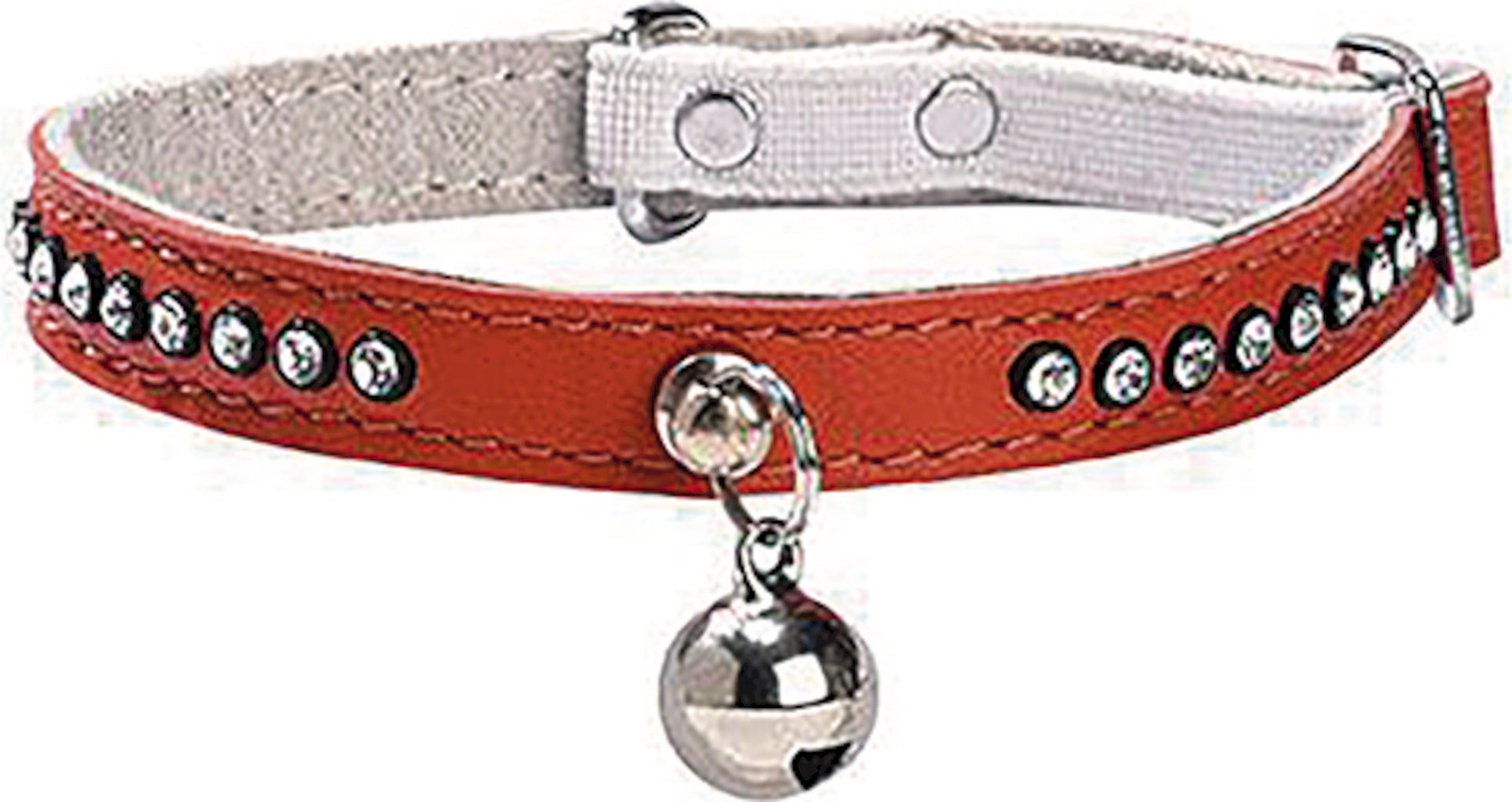Leather and rhinestones - a noble combination for cats whose human has a penchant for classic glamour. The stones are set directly into the leather, giving the band the appearance of a trendy necklace. With the bell adding a touch of playfulness, this charming creation is complete. The collar can be swiftly placed on your pet, and its size is adjustable. Furthermore, an anti-choking system protects against strangulation.