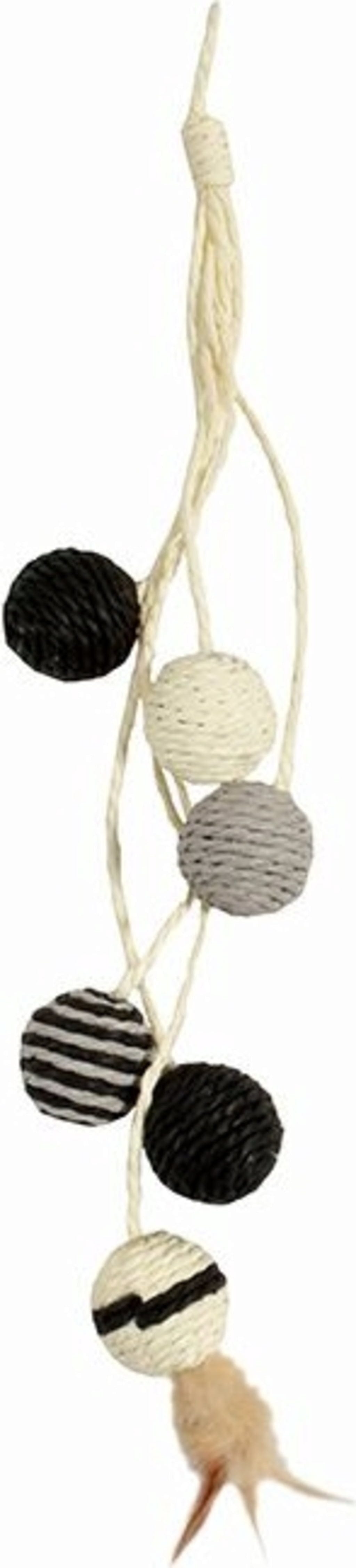 This hanging scratching toy is highly decorative thanks to its mobile structure in cheerful colours. Its handy dimensions allow you to place it anywhere: whether below a door handle or on sturdy hooks in the hallway. It is made from recycled paper rope - robust enough to withstand all scratching attacks - and includes several feather quills. This stimulates your cat's natural hunting and play instincts, providing ample entertainment.