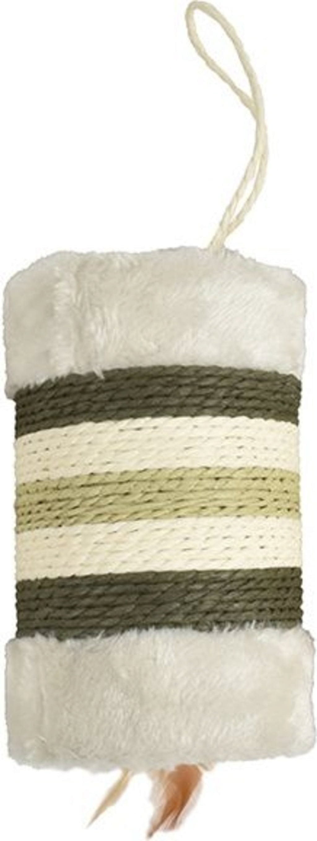 This roll is designed for hanging and is very convenient, as you can place it anywhere thanks to its handy dimensions. The roll is covered with recycled paper rope - robust enough to withstand all scratching attacks - and plush. Real feather quills at the end stimulate your cat's natural hunting and playing instincts, allowing them to entertain themselves.