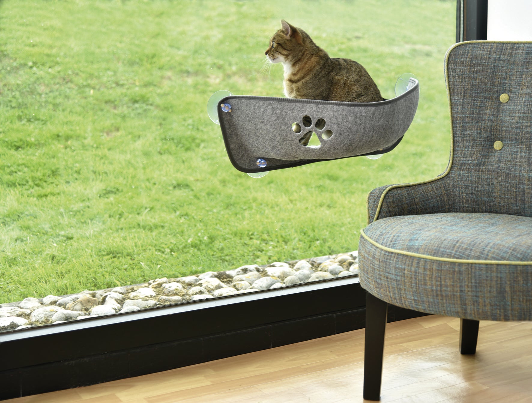 Does your cat love window seats? Then this hanging perch is ideal: it features extra-strong suction cups that provide secure hold on any glass surface. The cosy interior made of polyester offers your cat a comfortable viewing spot and is machine washable. The crescent-shaped basket is made of polyester felt and supports up to 9 kg in weight.
