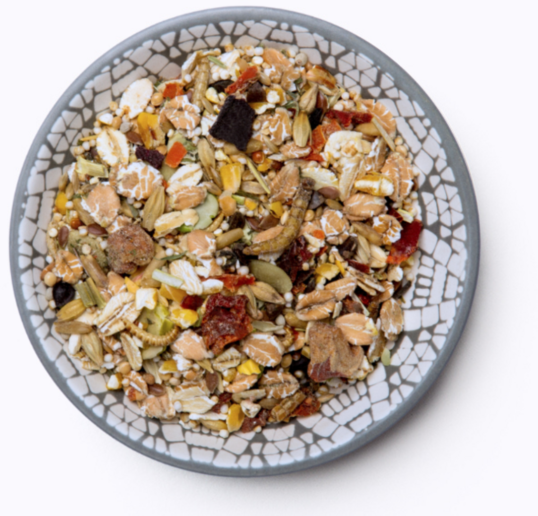 Cracked corn, Spelt flakes, Pea flakes, Barley, Barley flakes, Oat flakes, 5,2 % Oat kernels, Buckwheat, Wheat flakes, Plata millet, Quinoa seeds, Scagliola comune, 3 % Peeled pumpkin seeds, Amaranth puffed, Linseeds, Paprika, Carrots, Ribwort plantain, Lucerne, Silver millet, Perilla seeds, Beetroot, Apples, Red millet, Calcium carbonate, 0,5 % Mealworms, 0,4 % Buffalo worms, Wheat bran