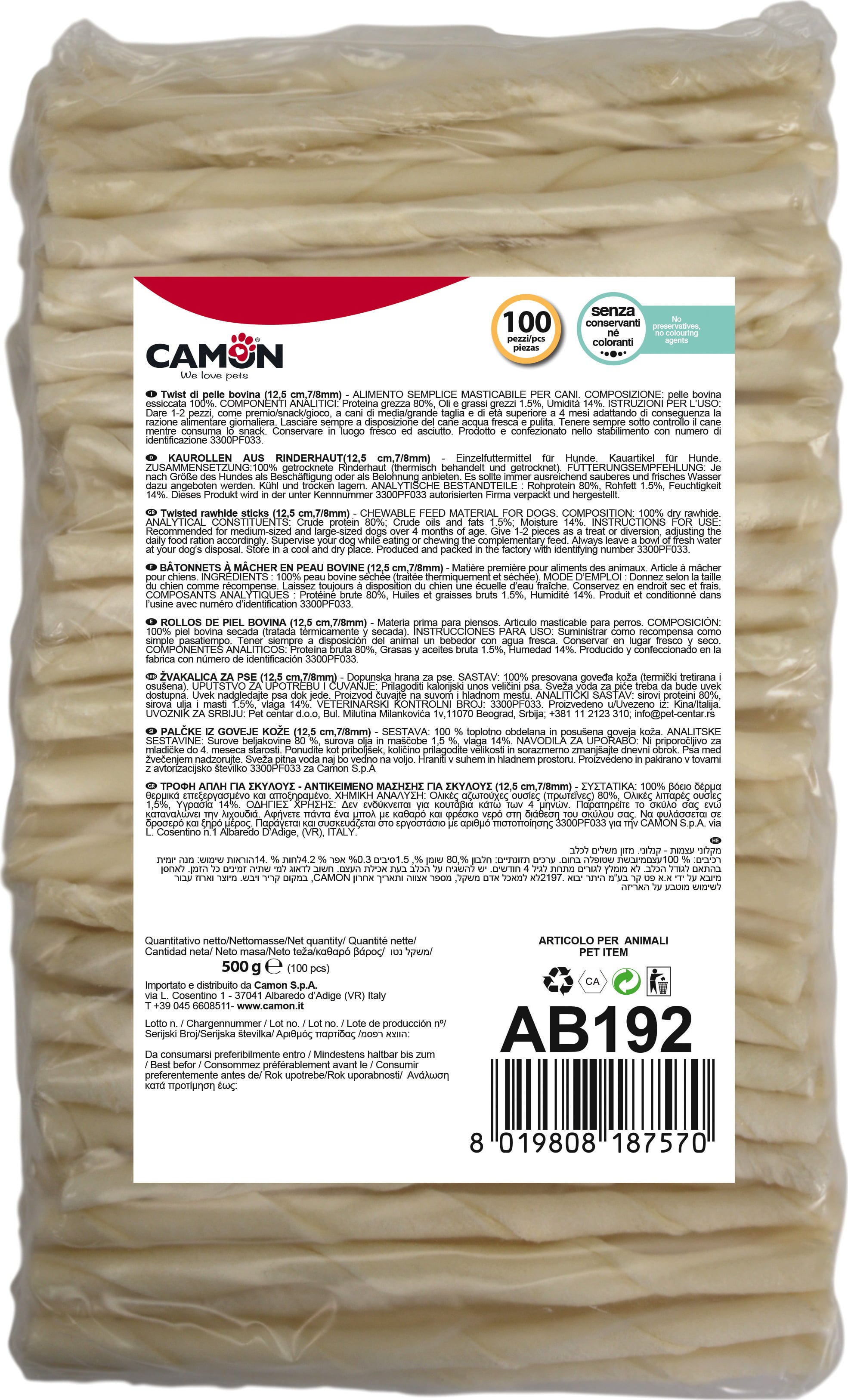 Camon Chew Rolls Made from Beef Hide, 100 pieces, Ø 7/8 mm x 12 cm (500 g)