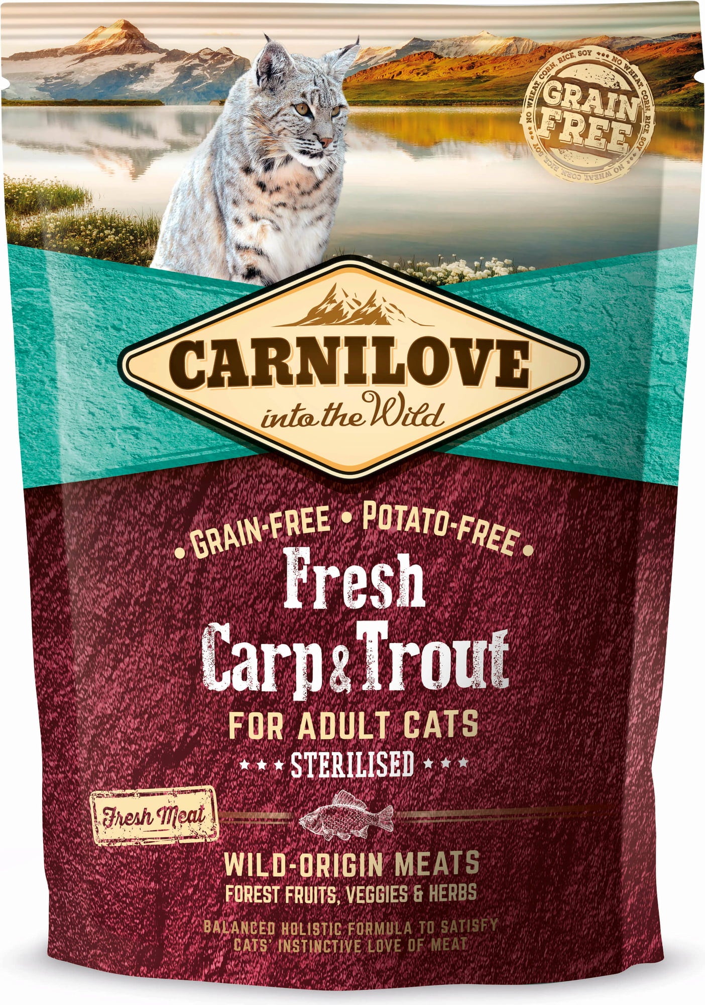 This gourmet recipe combines carp with trout. Naturally, as expected from Carnilove, the formula is completely free from grains and potatoes. Instead, the two protein sources are combined with selected fruits, vegetables, and herbs to provide all essential nutrients in the daily diet of your sterilised cat. Thanks to the fresh meat content, the Dry Pet Food Fresh is particularly well-received.