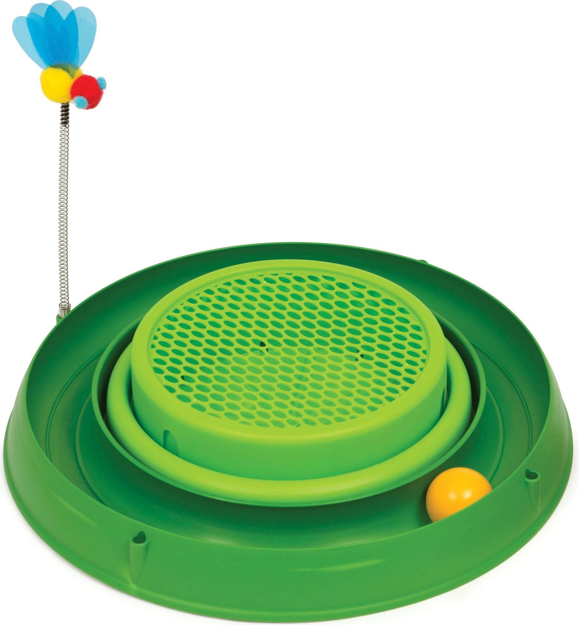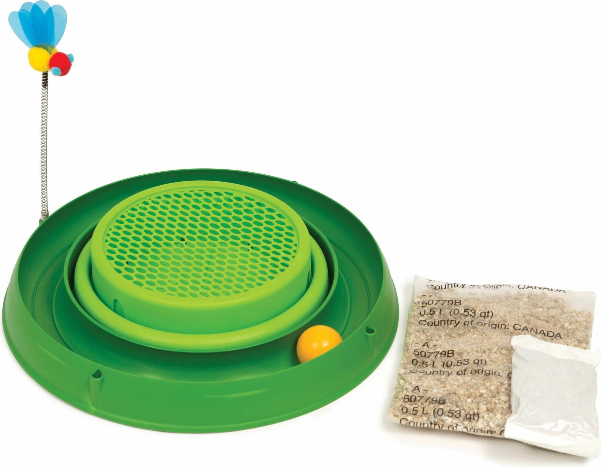 A cat play station with added value: The play rail with a ball encourages cats to play, while the bee on the edge wobbles with every nudge and invites further inspection. Fresh cat grass will soon sprout in the centre - substrate and grass seeds are included. The diameter is 36 cm, and the material is easy-to-clean plastic.