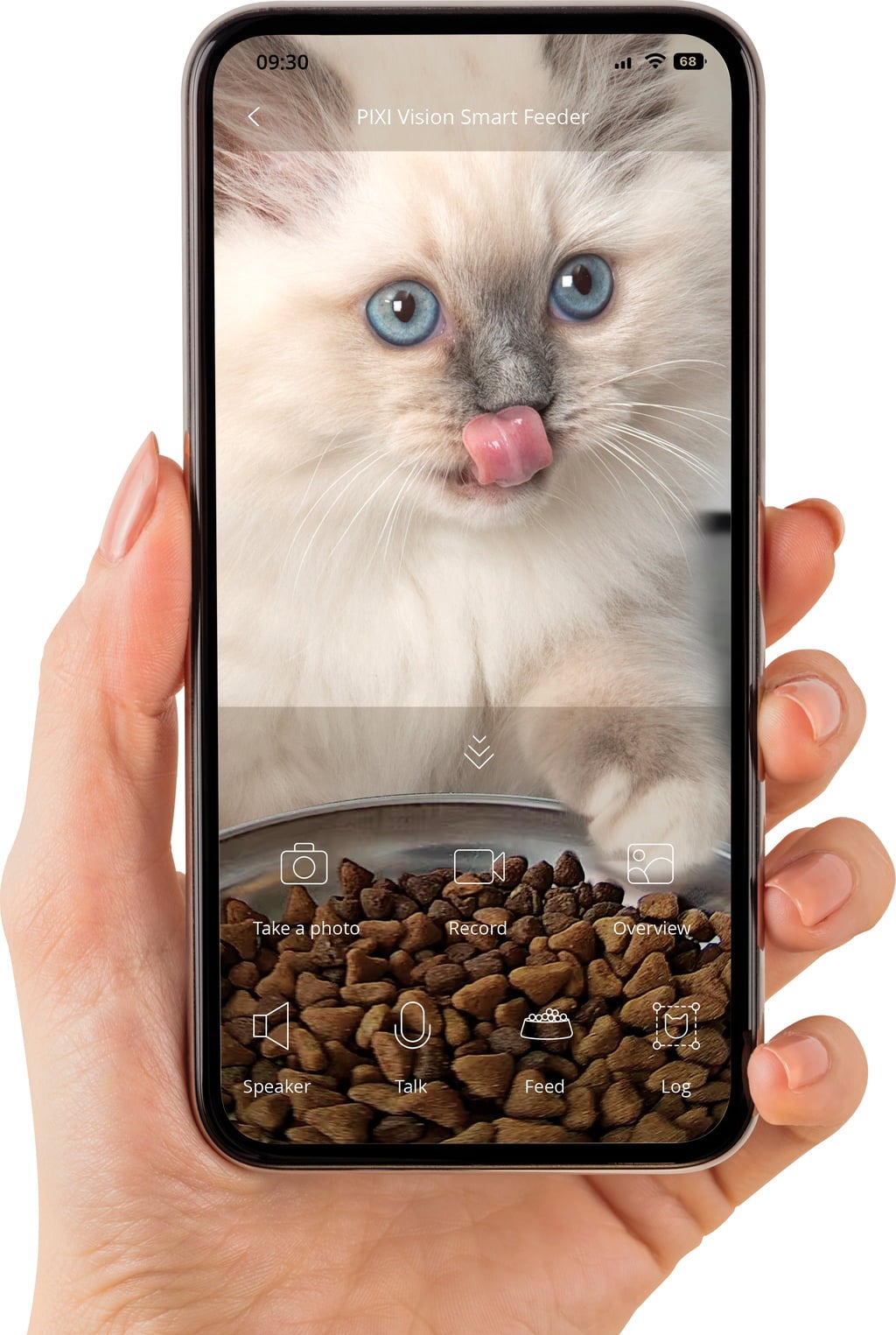 Stay connected with your cat, even when you're not at home! With the Pixi Smart Pet Food Dispenser Vision, you can feed your cat via the app and watch her through the camera. Using the microphone and speaker, you can even communicate with her.