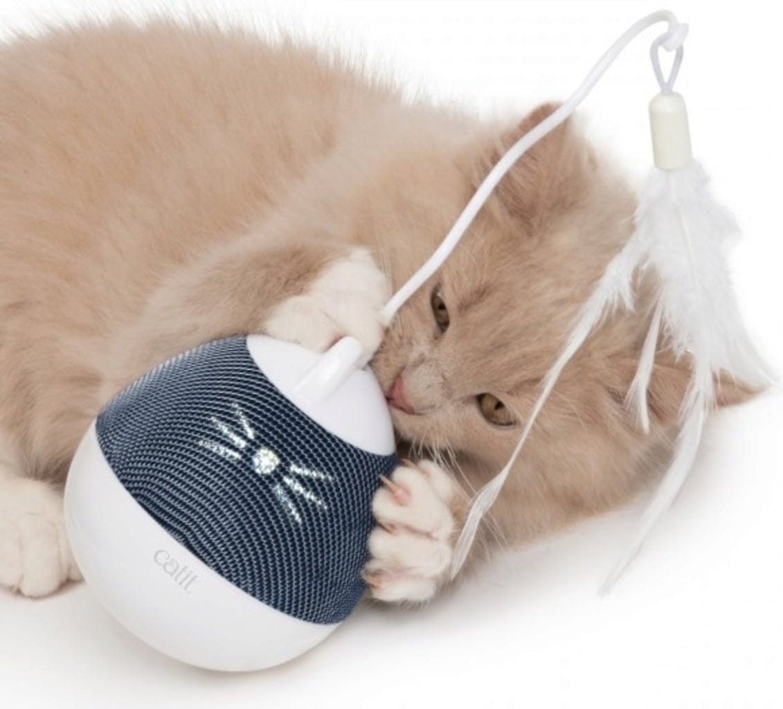 An integrated counterweight ensures the spinner automatically rights itself if accidentally tipped over. For even more play excitement, the dispenser is adorned with a replaceable feather accessory that piques the cat's curiosity and provides additional challenge.