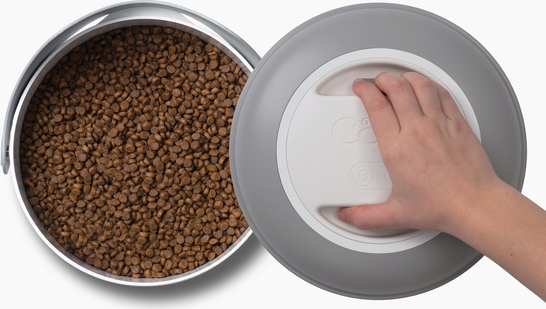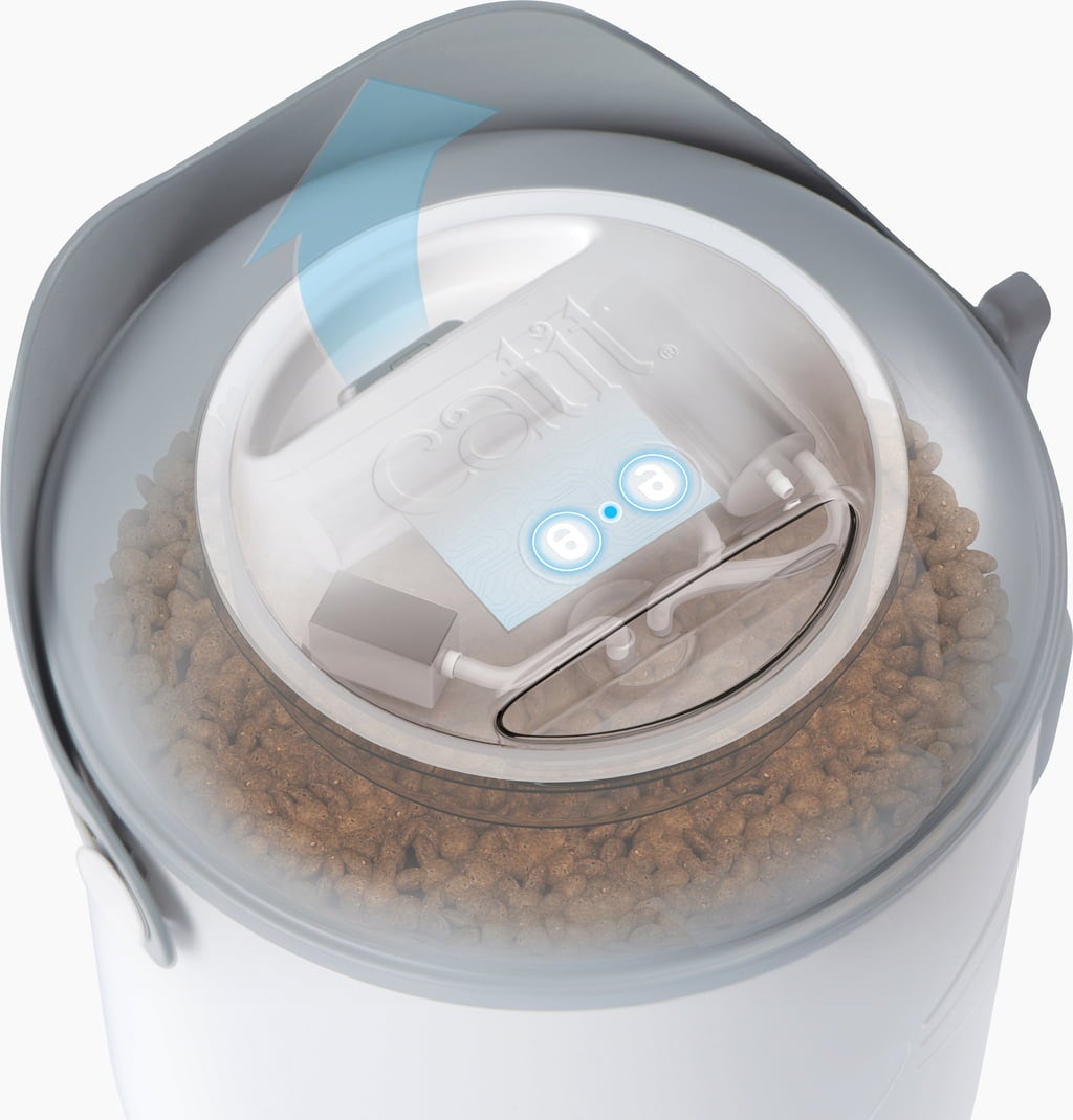 - You can activate the pet food container at the touch of a button, with a blue LED light indicating it is ready for use.