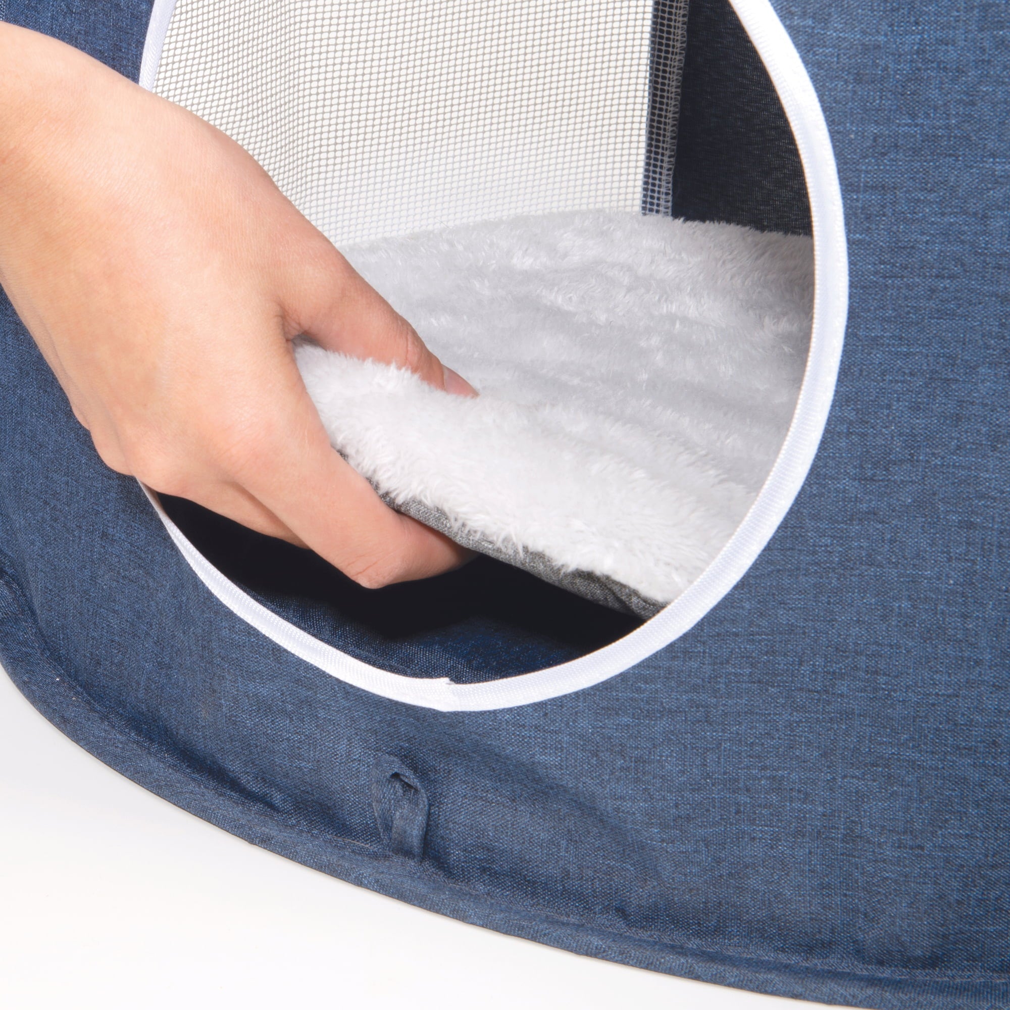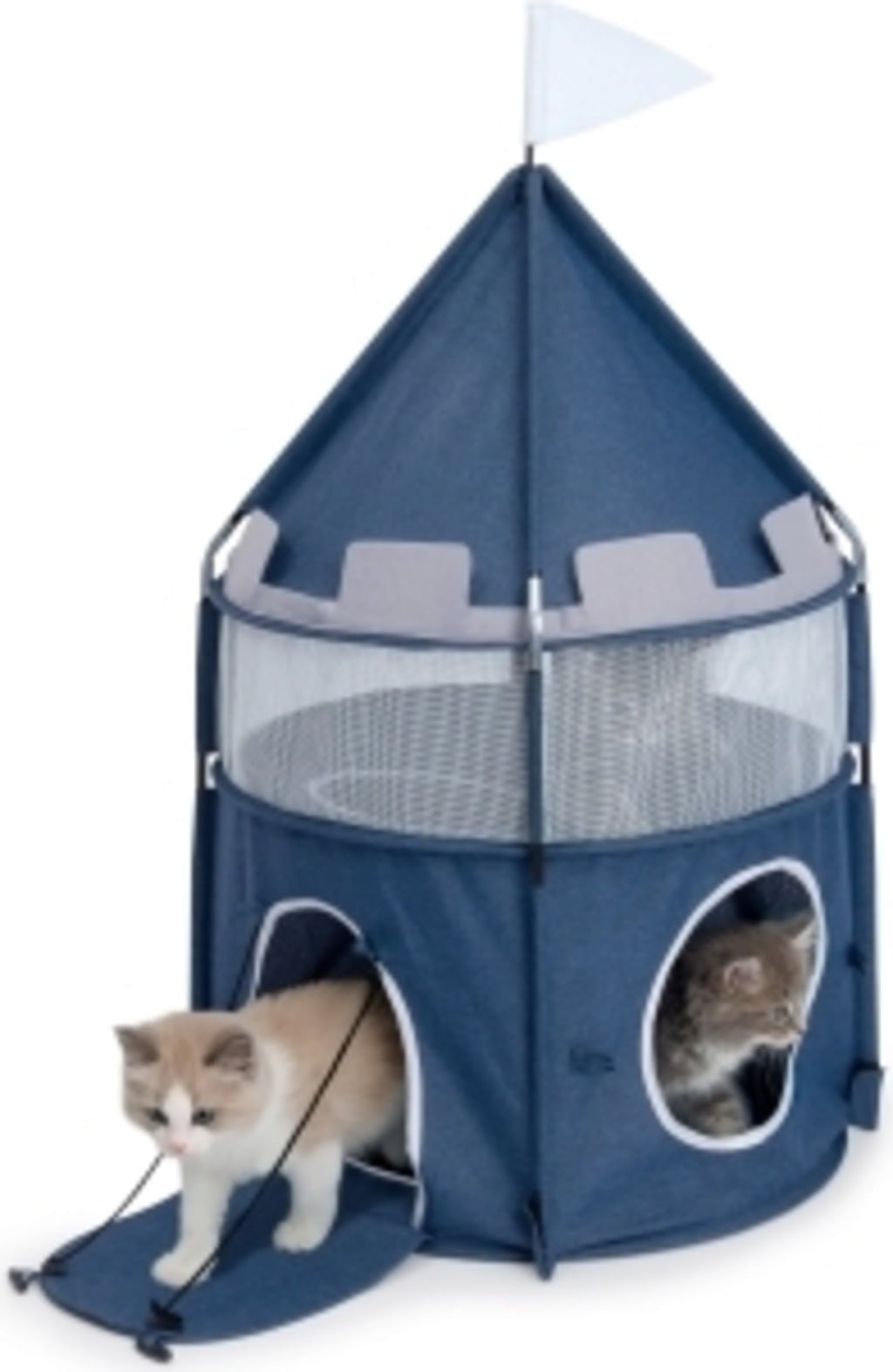 Royally enjoyable playtime for your cat. Enter the play castle via the amusing drawbridge. The lower area is comfortably cushioned with a pillow, while a mesh grille at the top ensures fresh air and a good view.