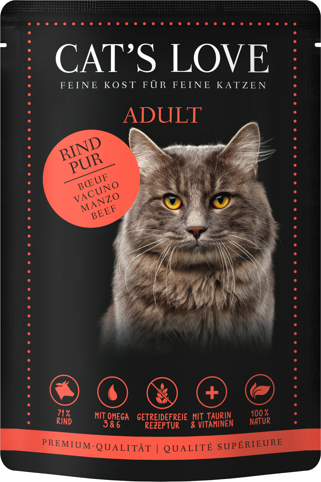 This single-protein wet pet food impresses with its high meat content of 71%, composed of beef hearts, liver, lungs and beef meat - providing your cat with high-quality protein, vitamins B and K, as well as calcium.