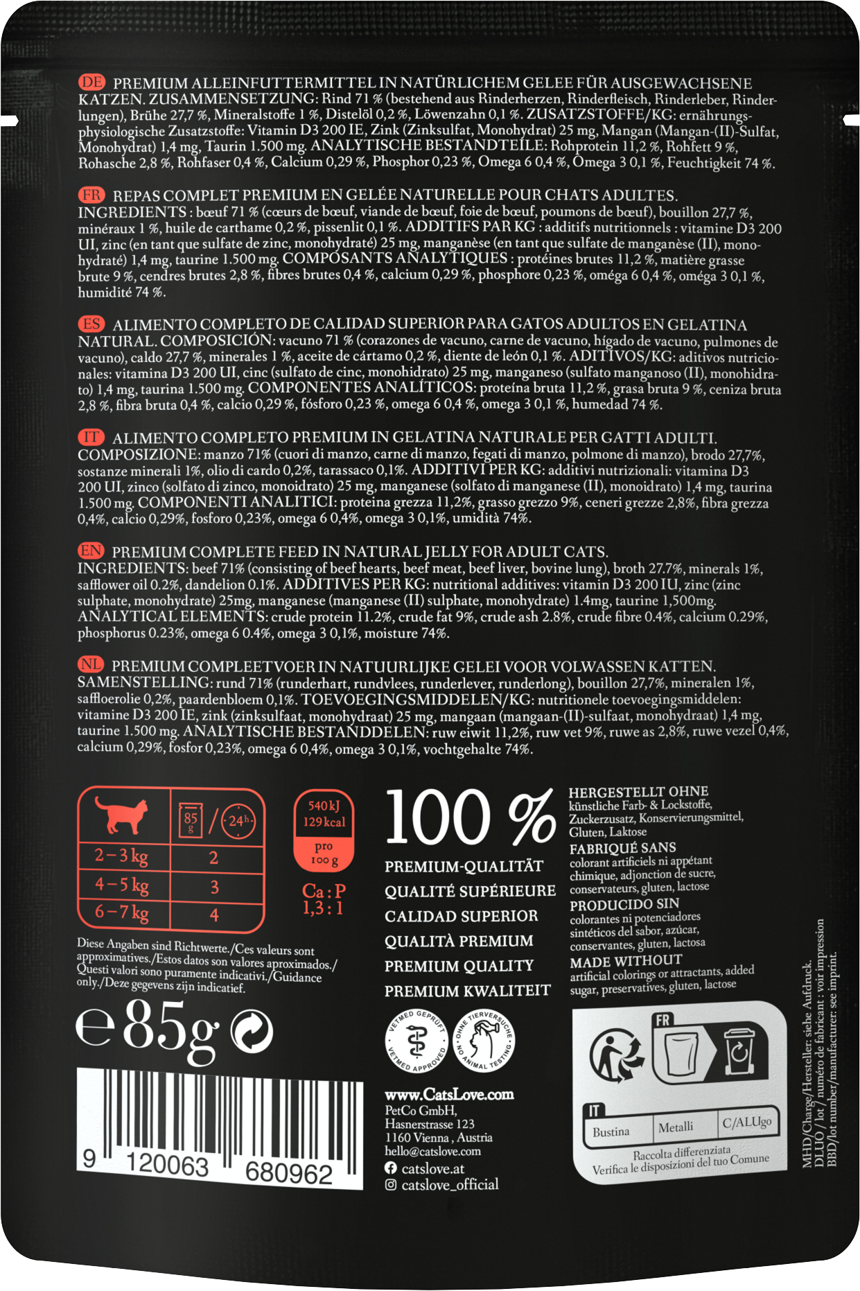 CAT's LOVE Adult Wet Pet Food Beef Pure for Cats, 85 g
