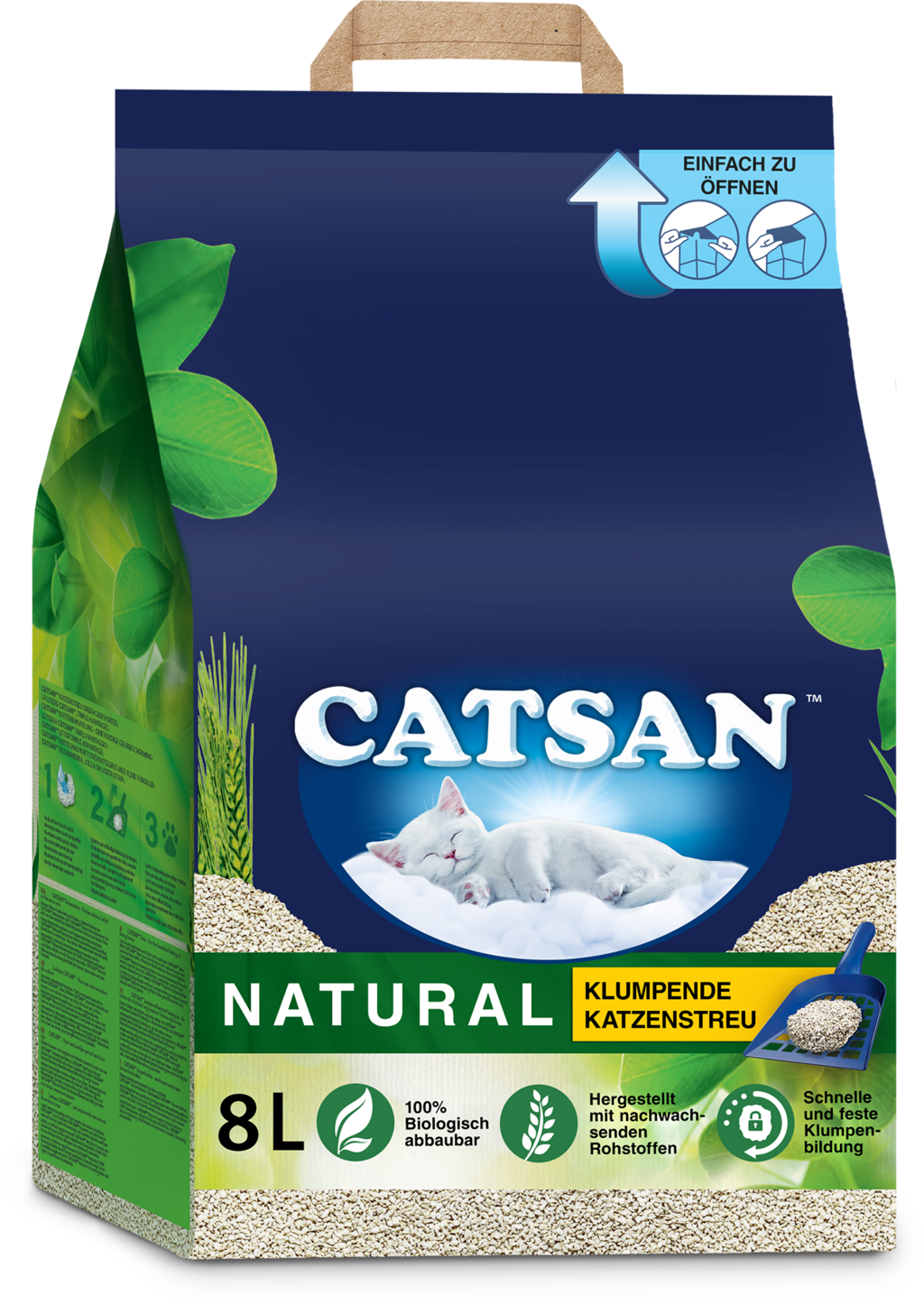 The litter box should be filled with at least 6 cm of Catsan Natural. Clean your cat's litter tray daily by removing clumps and other droppings. After removing the remains, the litter box can be refilled with the amount of cat litter removed.