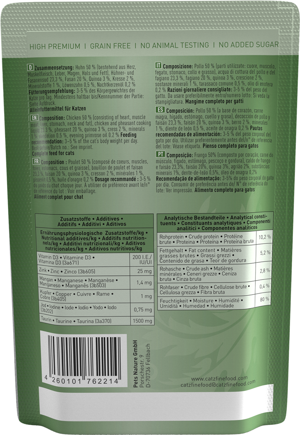 - Free from reformed meat, meat meal, fillers and meat substitutes, soy protein, grains, gluten, added sugars, attractants as well as artificial aroma and colouring agents