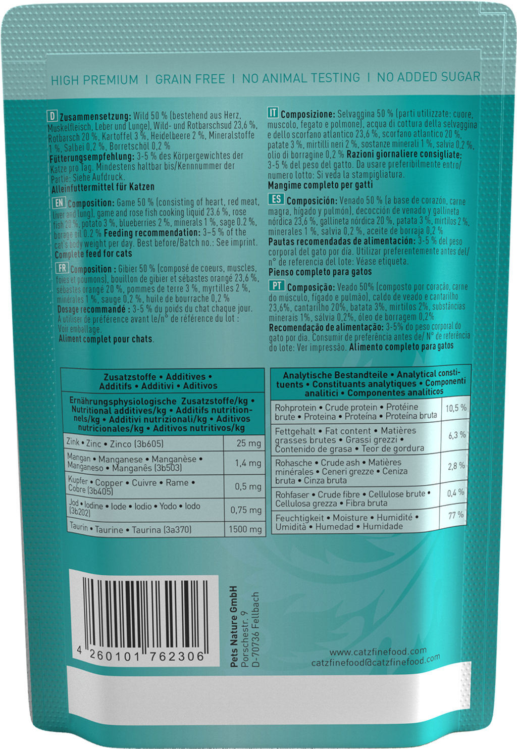With this premium wet pet food, you can treat your cat to something truly special, indulging them with selected natural ingredients of outstanding quality and exquisite taste. Formulated in line with the prey concept, this food respects the natural diet of your cat and thus brings back a piece of their original quality of life.