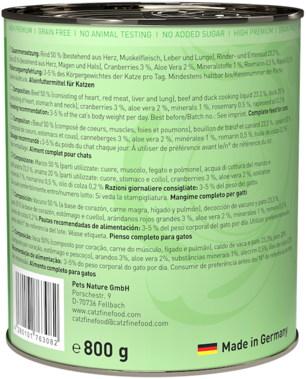 50 % Beef (Heart, Muscle meat, Liver, Lung), Beef broth, 23,3 % Duck broth, 20 % Duck (Heart, Stomach, Neck), 3 % Cranberries, 2 % Aloe Vera, 1 % Minerals, 0,5 % Rosemary, 0,2 % Rapeseed oil
