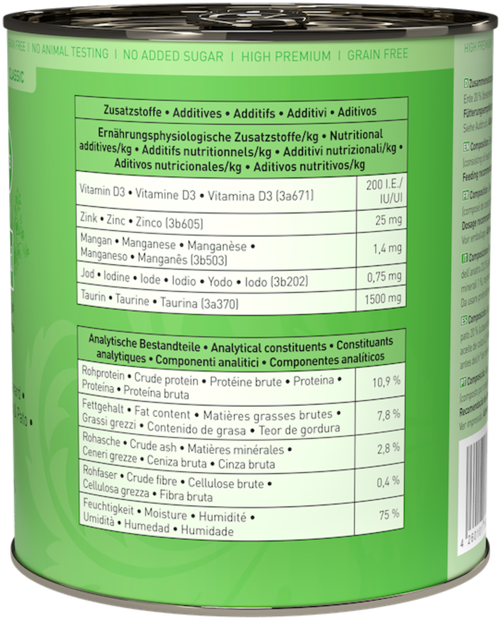 - Free from reformed meat, meat meal, fillers and meat substitutes, soy protein, grains, gluten, added sugars, attractants, as well as artificial flavourings and colourings