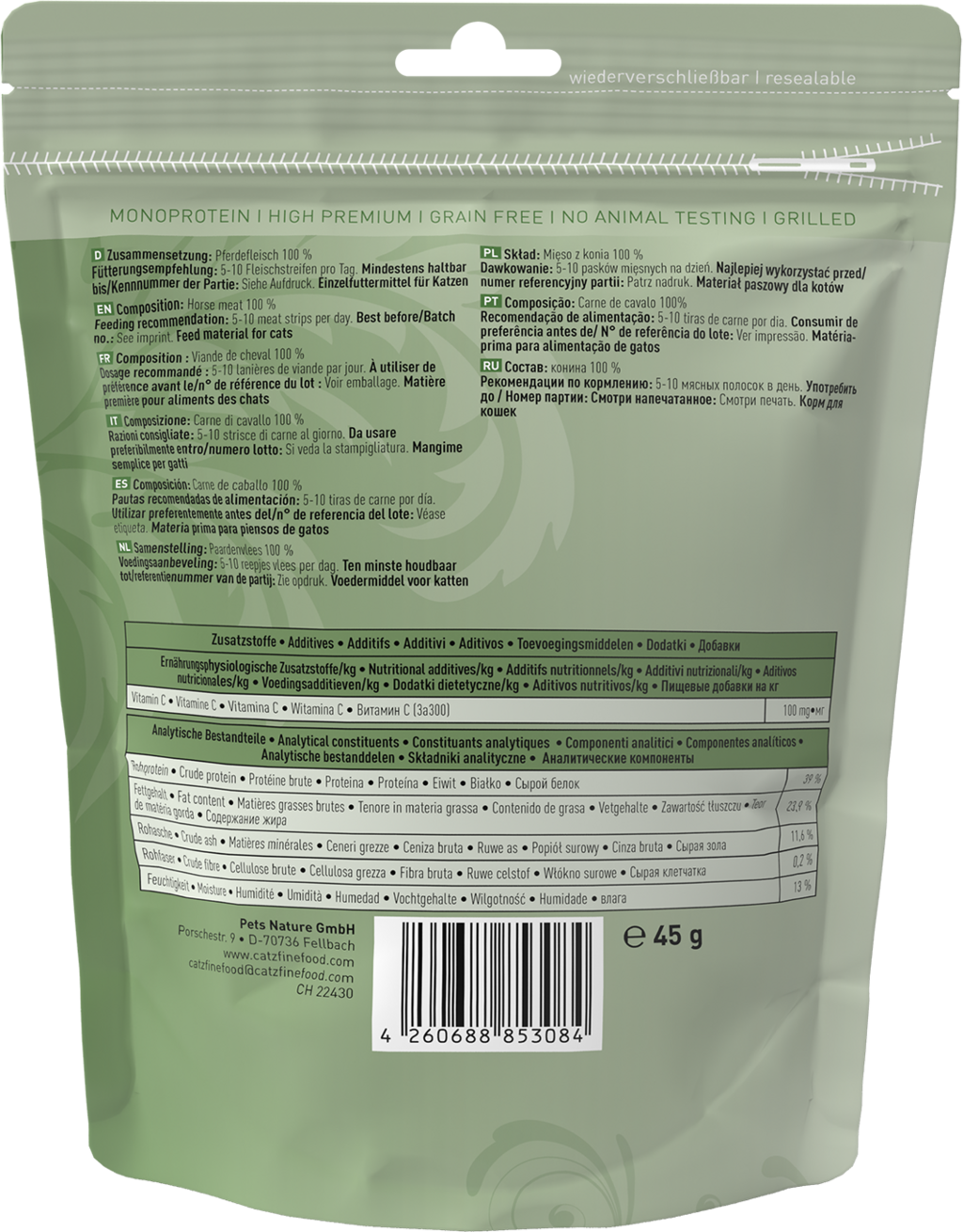 | Product Properties: | Free from colours, Non-GMO, Free from flavour enhancers, Preservative-free, Free from artificial colours, Free from artificial colours and attractants, Free from artificial flavours, Free from added sugar, Grain-free, Gluten-free, Monoprotein, Free from animal testing |