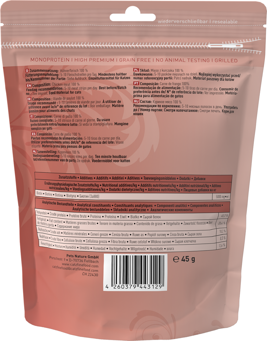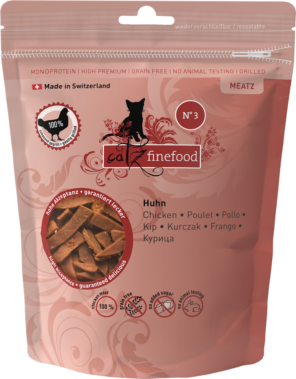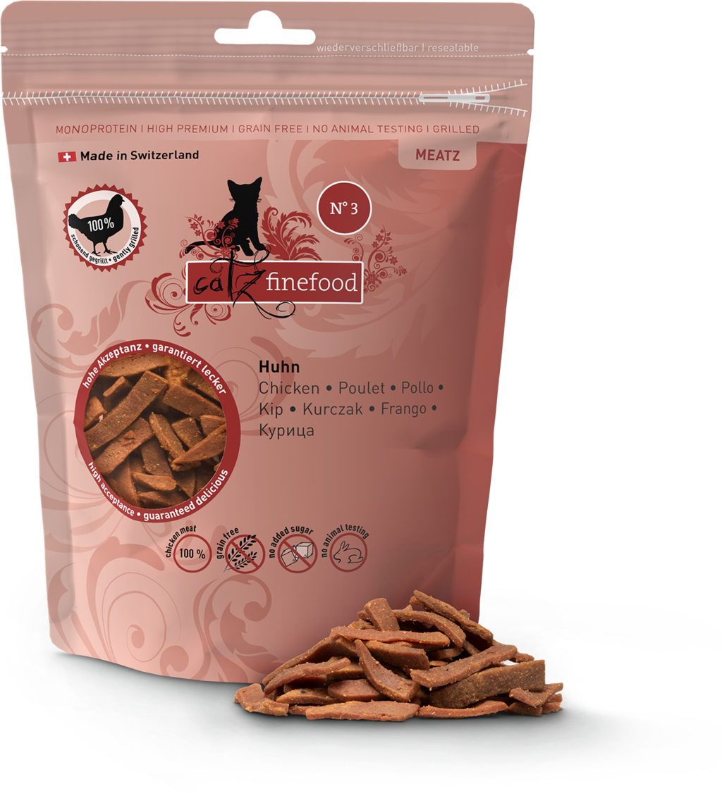 Cat, meat, Meatz? It doesn't matter, as long as it tastes as delicious as these grilled and subsequently gently air-dried meat strips that are an irresistible snack for your cat, pampering them with a particularly high meat content and one other valuable ingredient per variety. Delightfully crispy on the outside, tender on the inside, with an intense meaty aroma - with this tempting reward, even the trip to the carrier becomes a breeze.