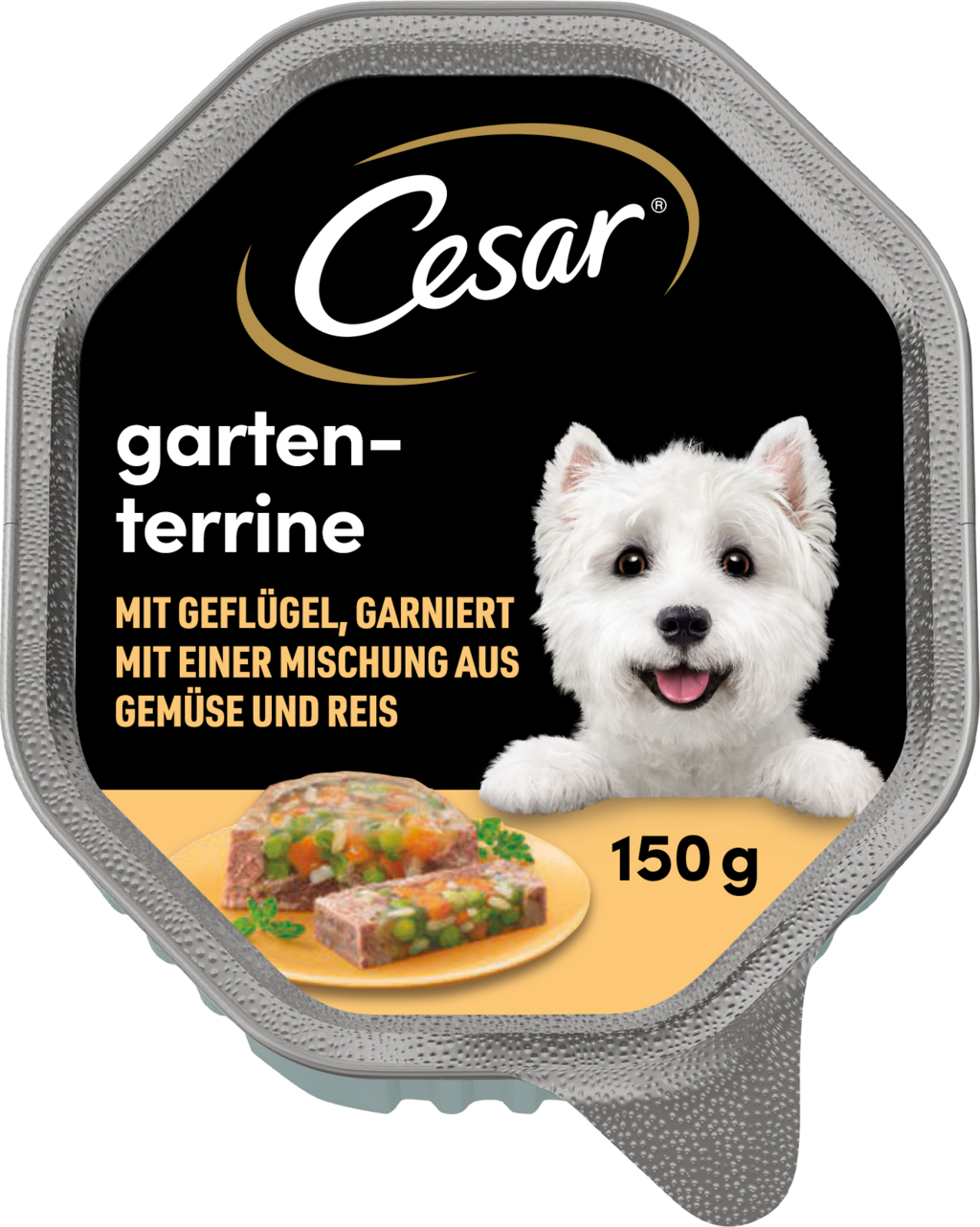 Cesar Garden Terrine is a complete wet food for adult dogs. The recipe contains carefully selected ingredients. High moisture and protein content make the daily menu a balanced meal. The succulent meat pâté with vegetable rice preparation and jelly offers every four-legged friend a welcome change.