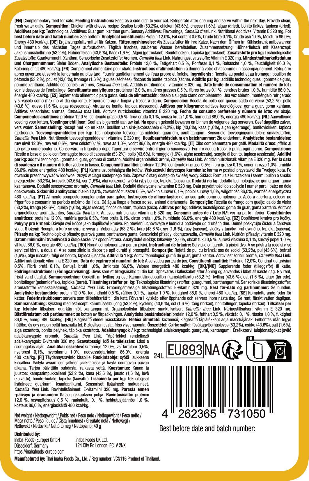 53,4 % Scallop broth, 43,4 % Chicken, 1,6 % Cheese, Bonito flakes, Dried tapioca, Agar, Guar gum, Xanthan gum