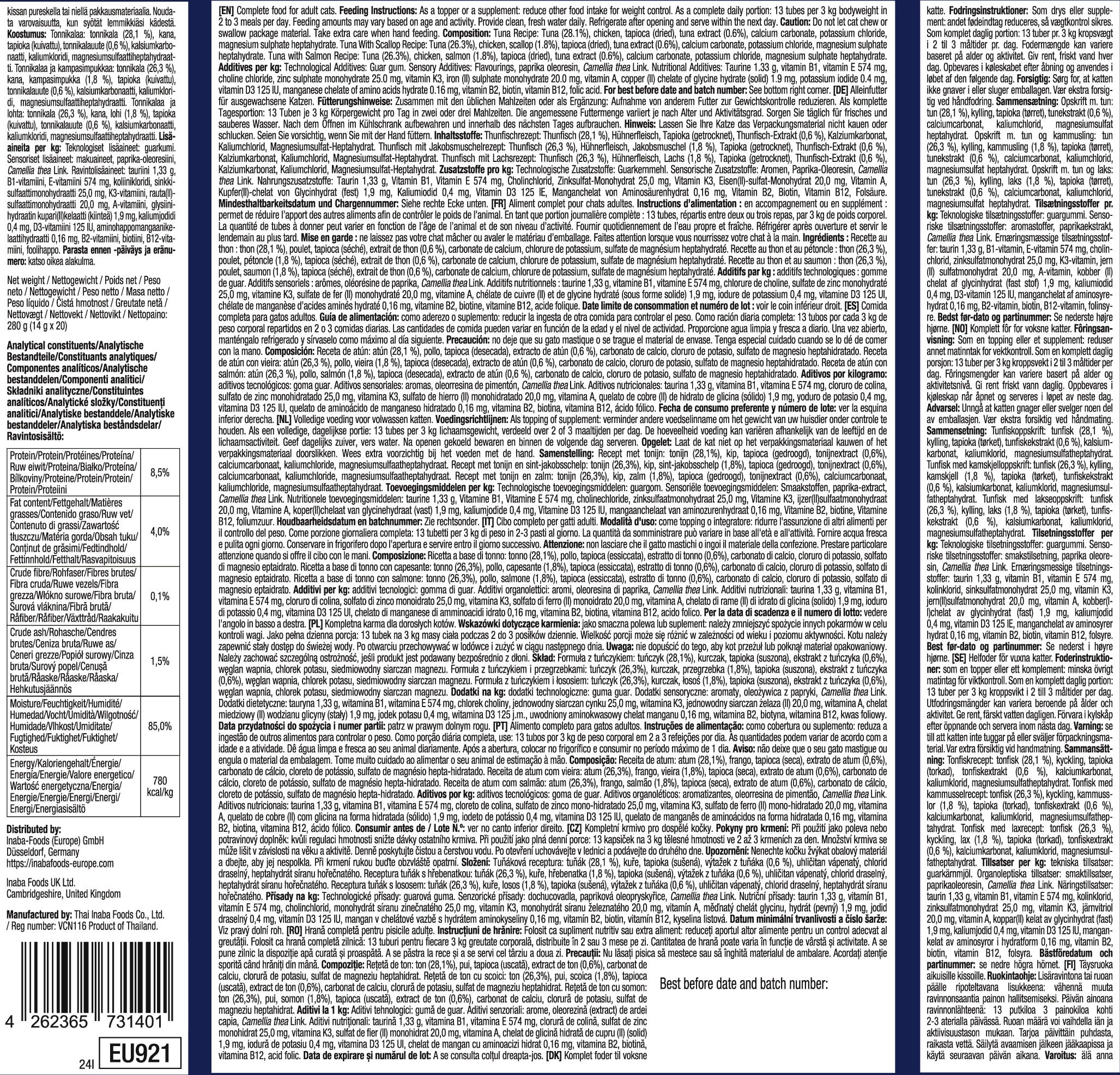 26,3 % Tuna, Chicken, 1,8 % Scallops, Dried tapioca, 0,6 % Tuna extract, Calcium carbonate, Potassium chloride, Magnesium sulphate heptahydrate, Guar gum