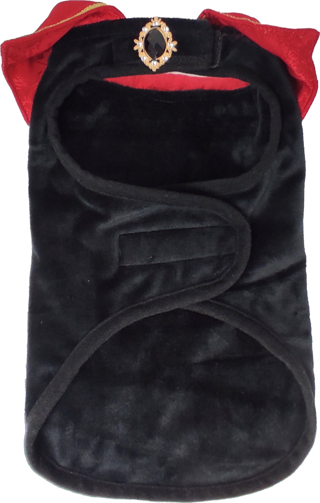 - Black cape with a red collar & gold detailsVelcro fastening at the neckElastic bands for hind legsWith a hole to attach the lead