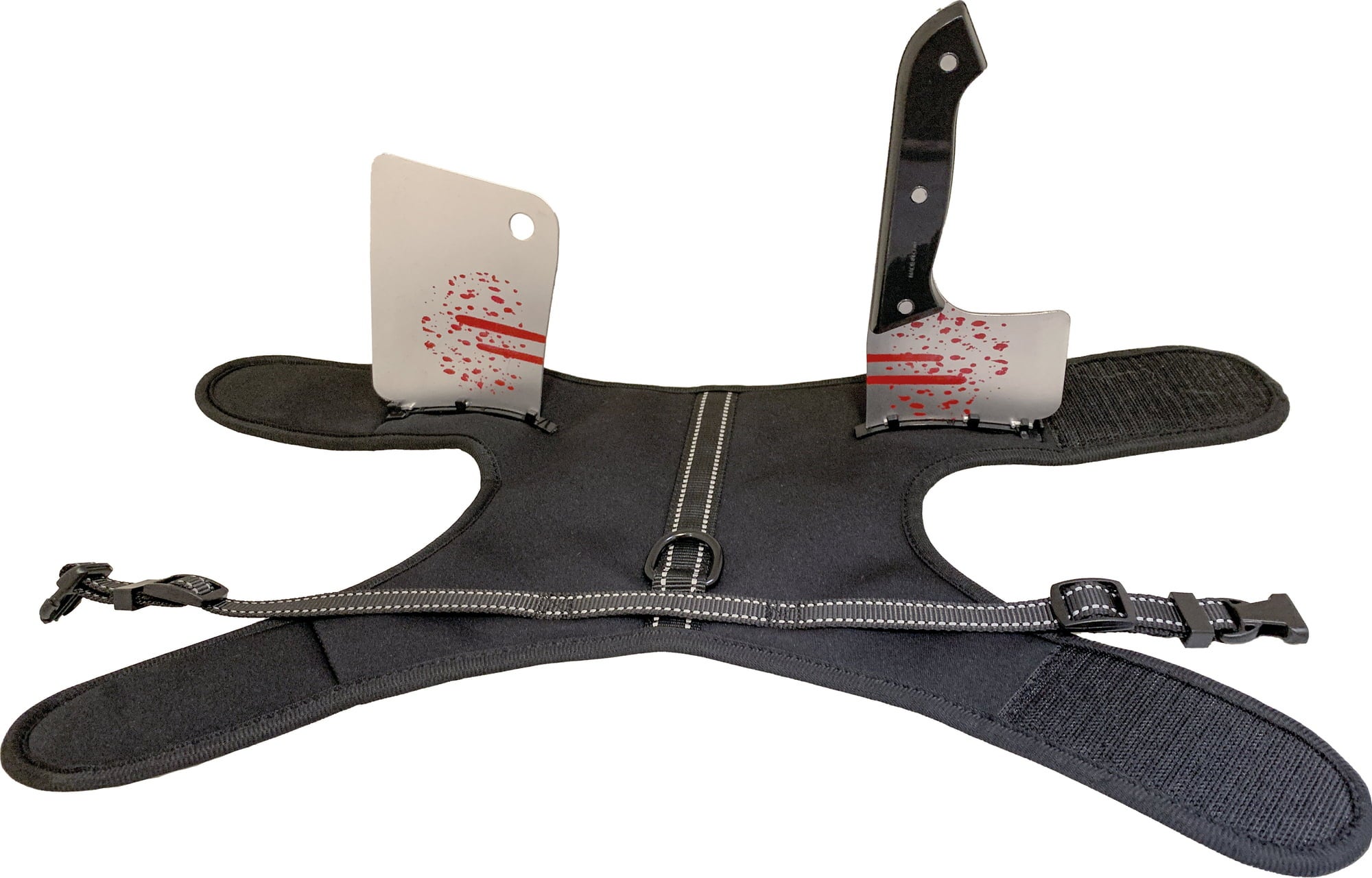 The harness is made from high-quality, durable black neoprene fabric. The bloody axe pendant made of lightweight plastic gives the costume the ultimate scare factor, appearing as though it pierces your cute dog's body. What a terrifying horror show!