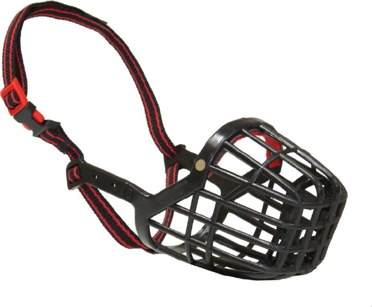 The muzzle includes an adjustable nylon strap with a plastic snap closure. Its open design ensures good ventilation so your pet doesn't feel confined.