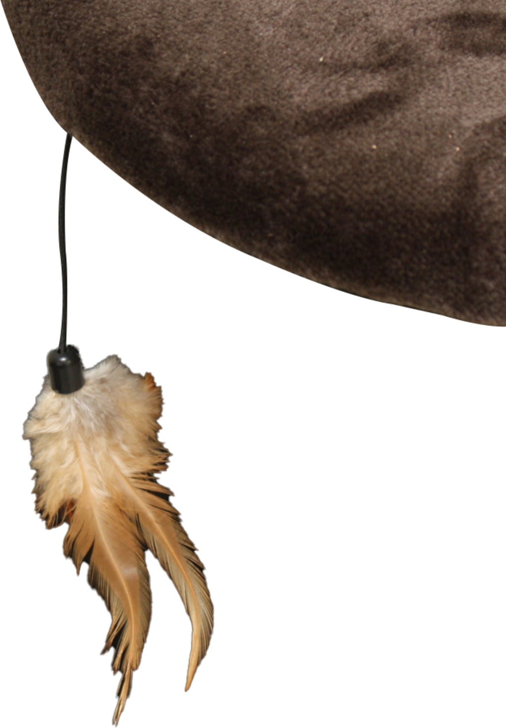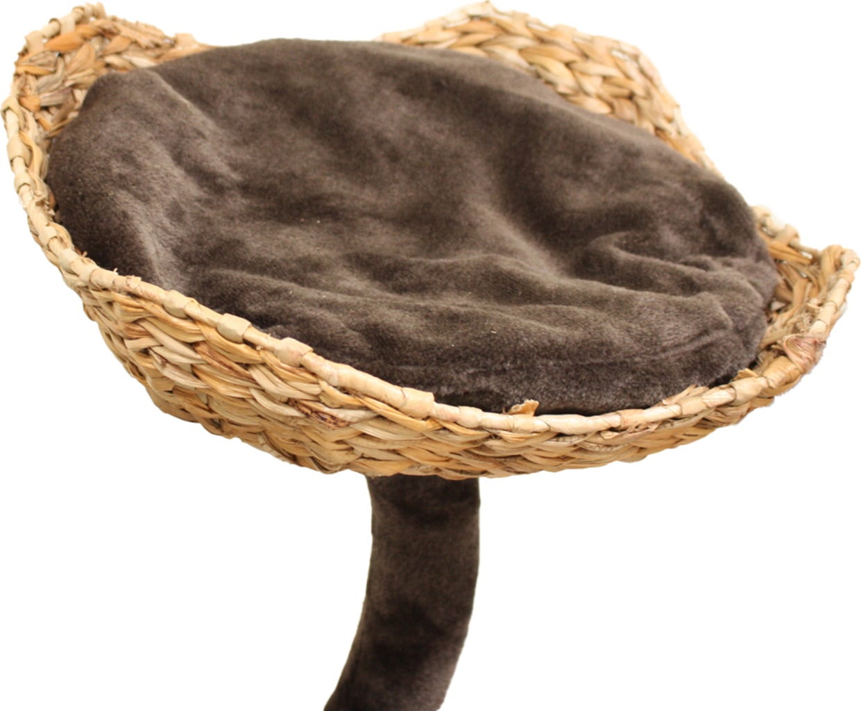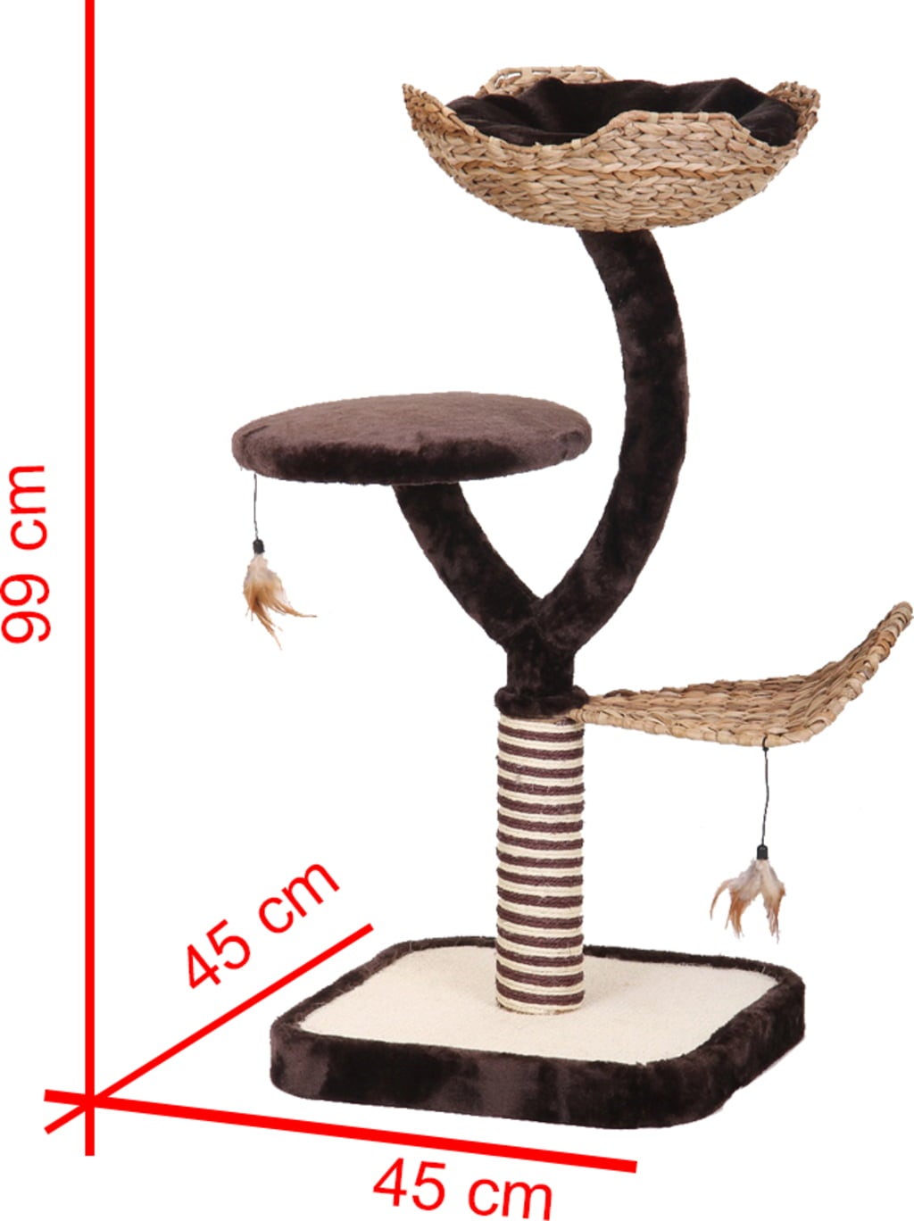 The pillar is wrapped in sturdy sisal rope, perfect for sharp claws, and can be replaced if needed. The basket is made of water hyacinth and comes with a custom-fit cushion made of plush. The super-soft material adds a touch of luxury that your cat will surely appreciate. The cushion can be washed if necessary. A feather wand dangles temptingly, encouraging play. The cat tree has a total of three levels.
