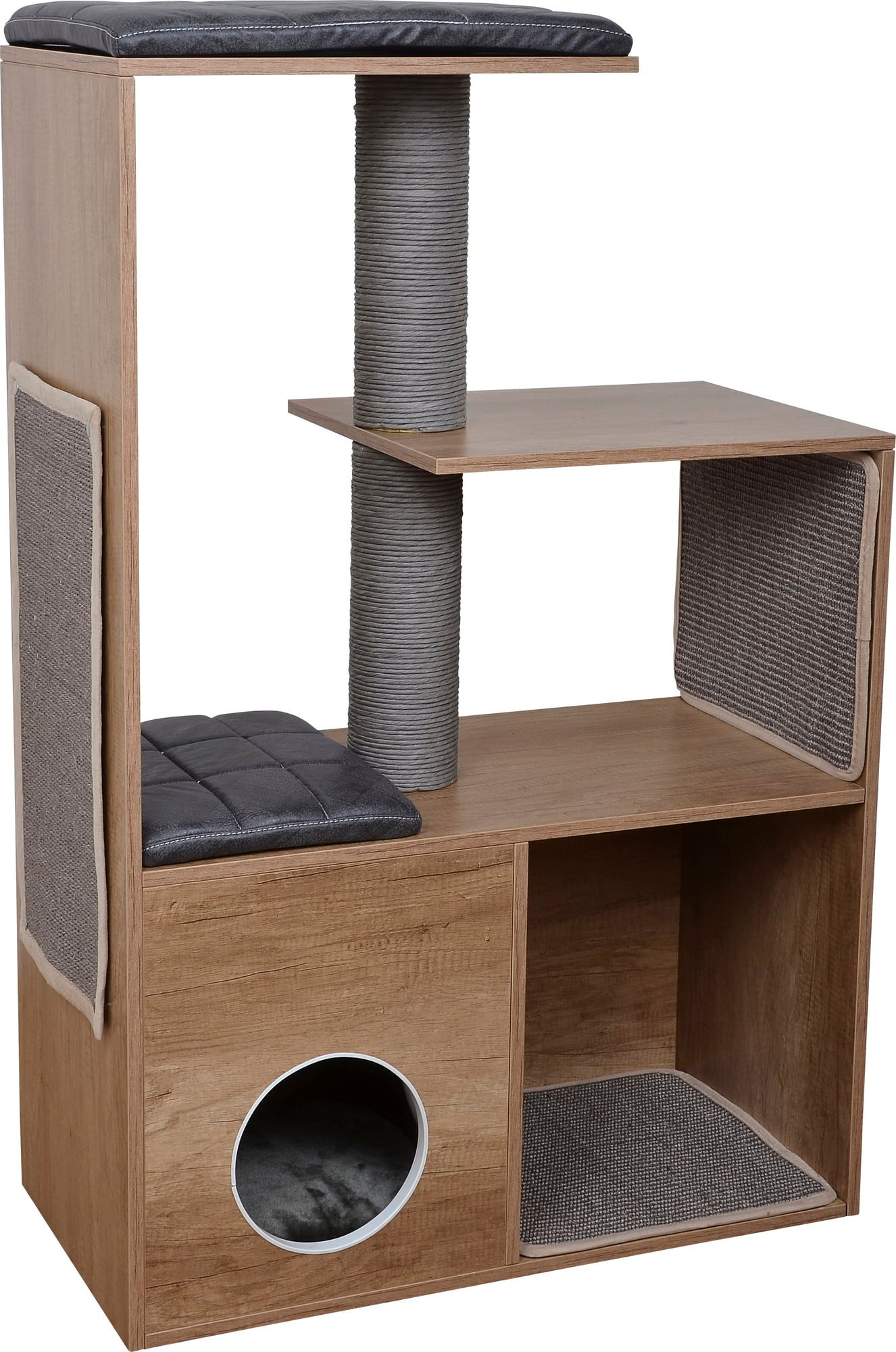The scratching post is also equipped with two padded cushions made from scratch-resistant leather fabric. These repel cat fur and other dirt, making them very easy to clean. The scratching pole can be exchanged with a replacement pole to ensure your fluffy friend always has plenty of scratching options! At the base of this scratch paradise, there's a genuine cat cave. It offers protection from light and invites your cat to take a peaceful nap, while also serving as a secure retreat when your cat needs a break from company.