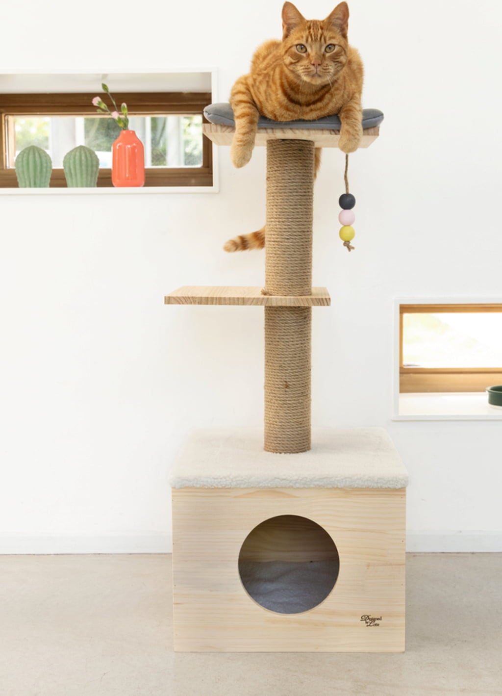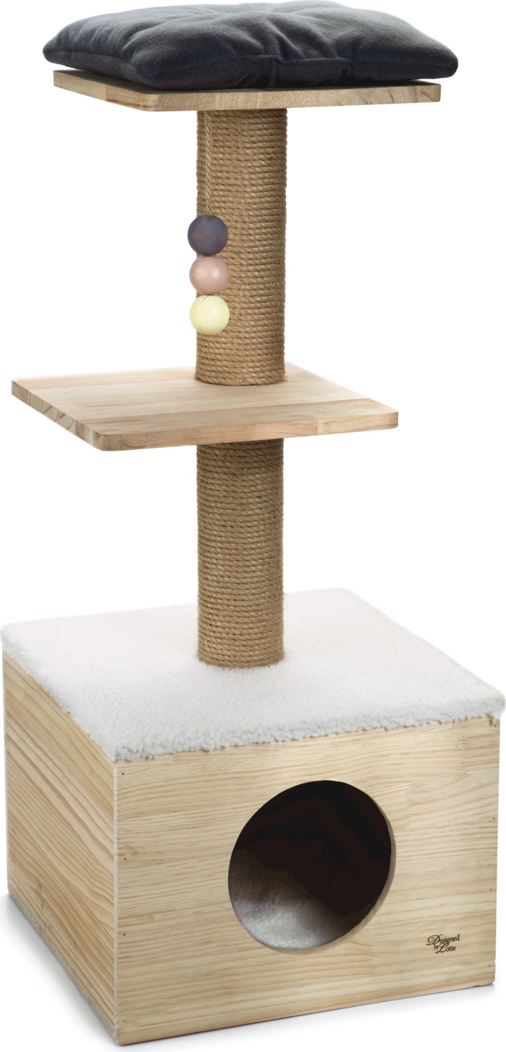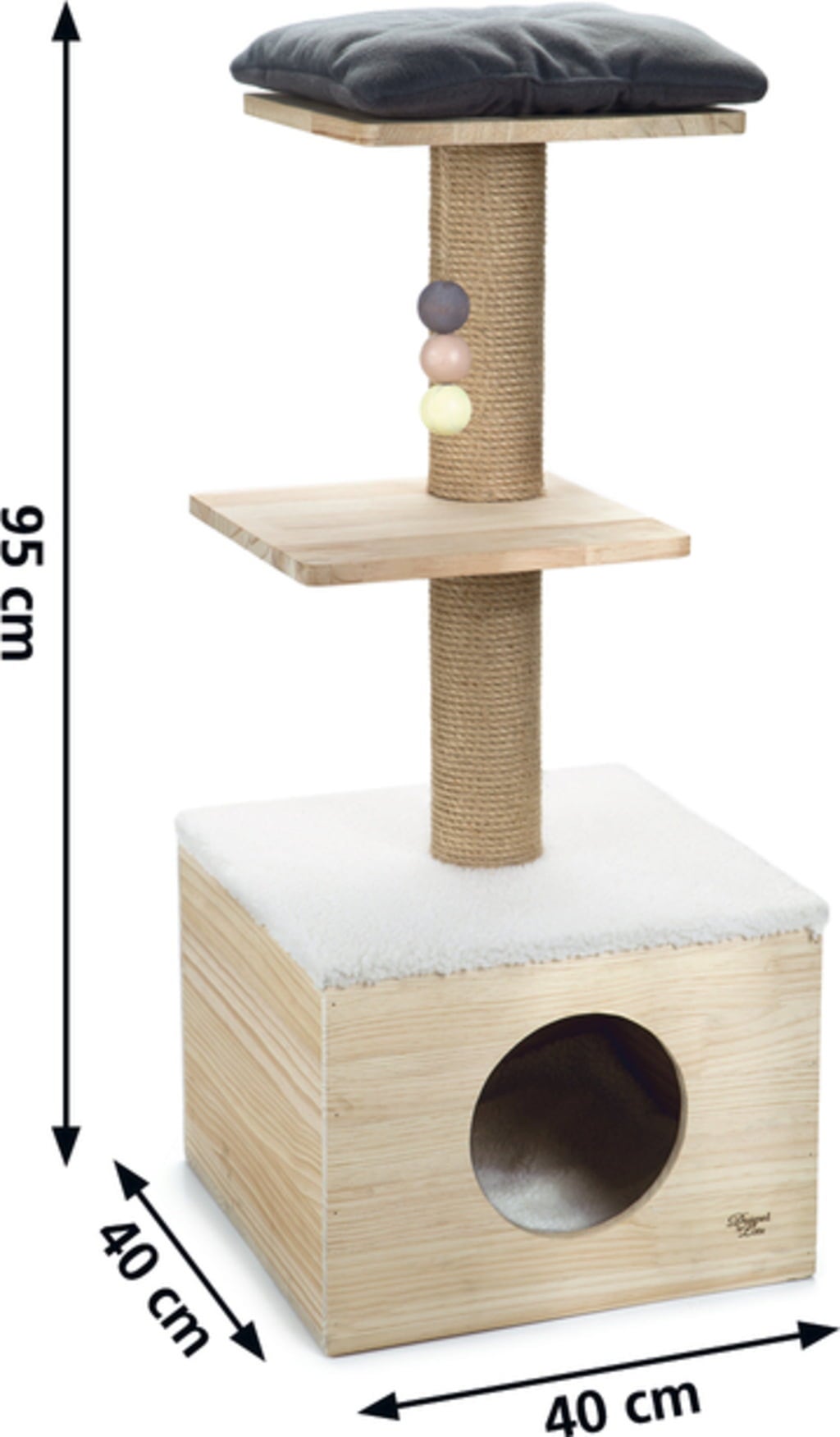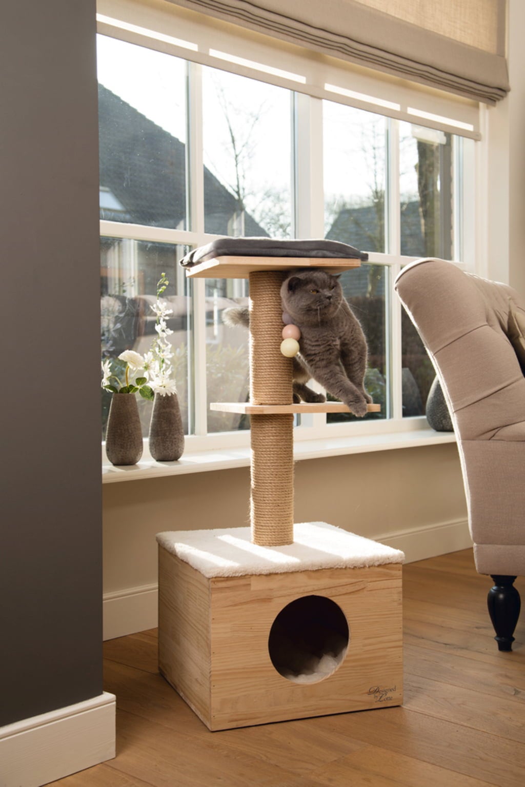Scratching, playing, sleeping – that's all it takes for a happy cat's life. This scratching post offers a viewing platform, cosy den, scratching column, and play balls, all wrapped in a stylish design. Perfect for happy cats and satisfied owners.
