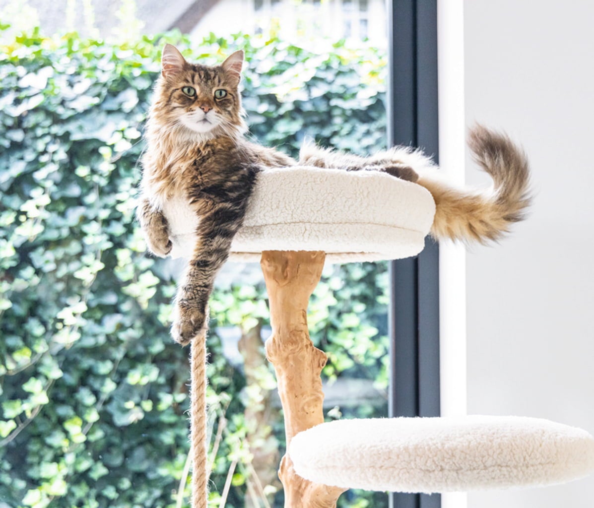 This scratching post, with its white plush platform, plush basket, and leg made from natural pear and date wood, not only looks highly aesthetic but also offers your cat various resting, playing, and scratching opportunities. It is an absolute must-have for any stylish cat household.