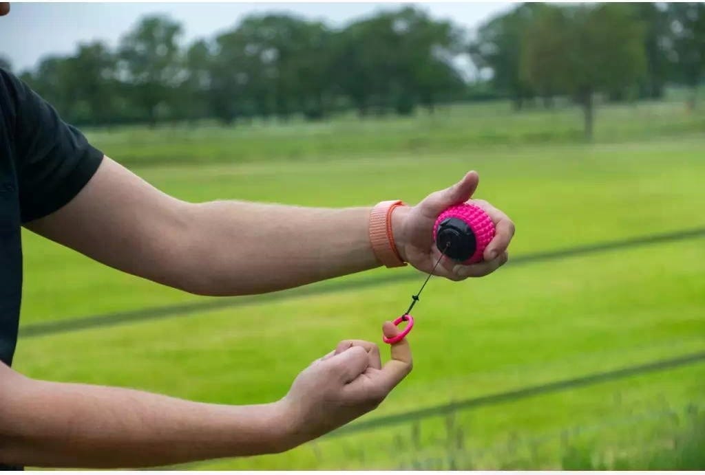 - With an integrated cord that automatically retracts into the ball